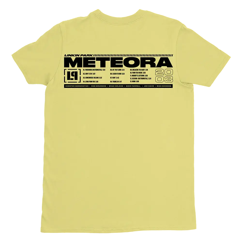 Желтый корпус с изображением граффити «Cuidado» на лицевой стороне и треклиста Meteora на обороте. В честь 16-летия студийного альбома Linkin Park «Meteora» мы создали несколько новых предметов с изображением обложки альбома.