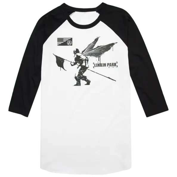 Белая футболка с рукавами реглан и черными рукавами. Мягкий ручной принт спереди с изображением флага LP и солдата Side Street.