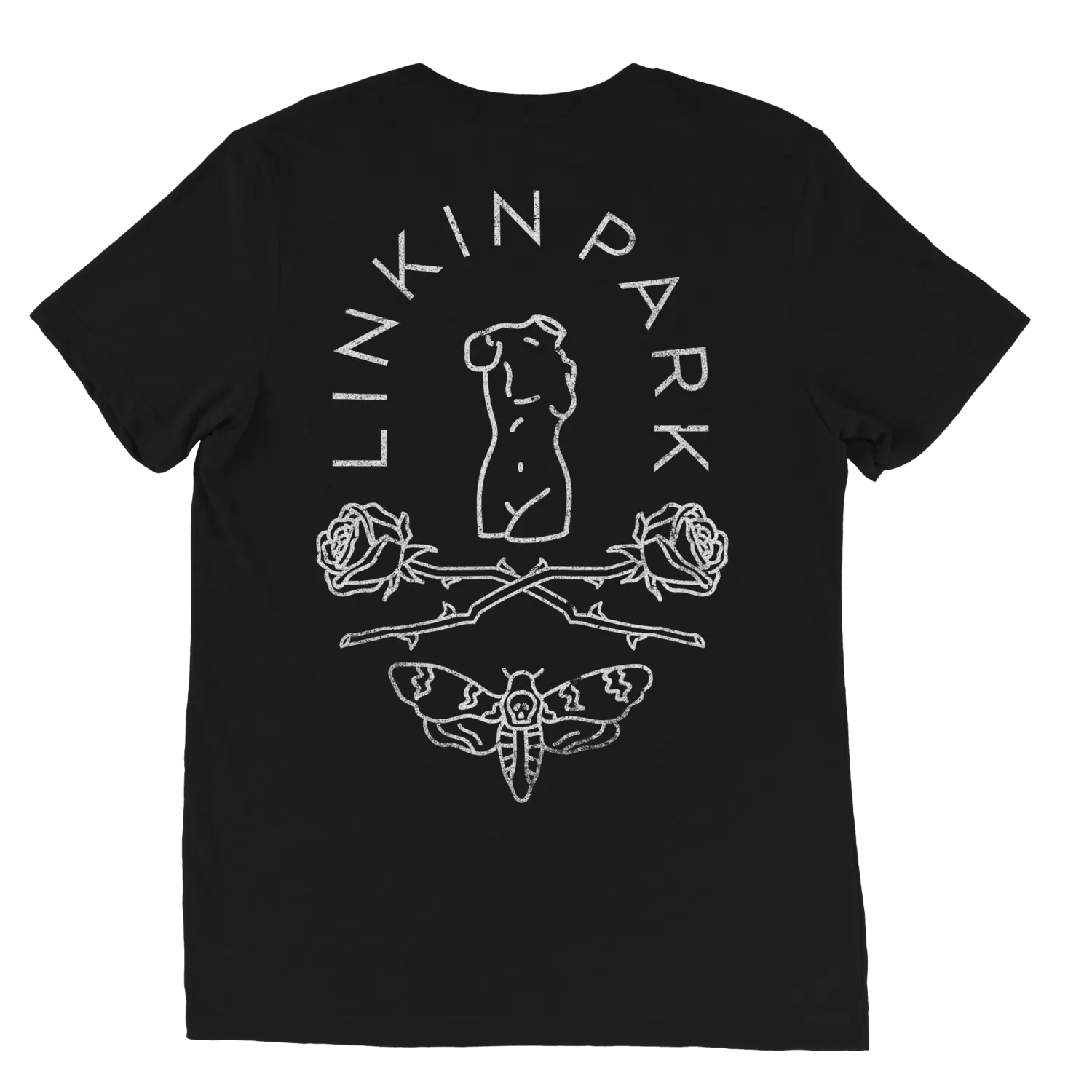 Черное тело, белый дистресс-принт с логотипом LP Hex на левой груди и рисунком BMR Moth на спине.