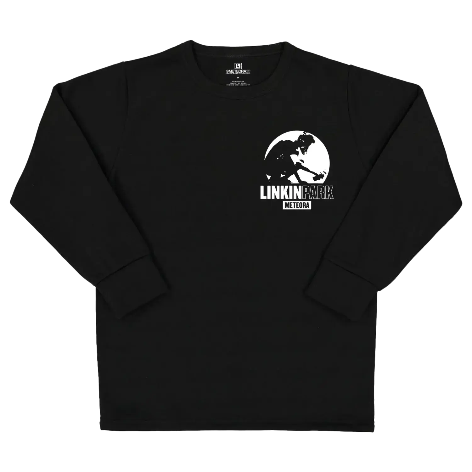 Черная термоткань из плотного вафельного трикотажа с графическим принтом Linkin Park // Meteora на левой груди спереди. 100% хлопок.
