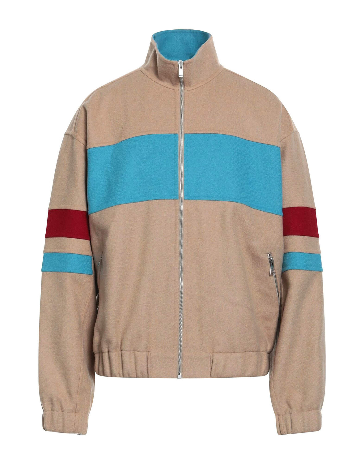Куртка бомбер от Lanvin песочного цвета с голубыми и красными полосами.