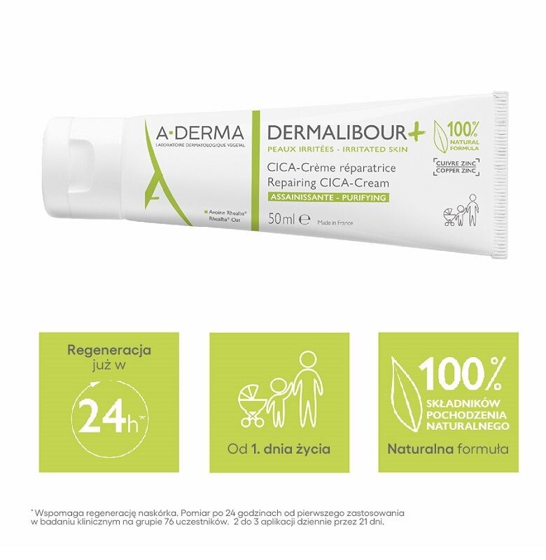 DERMALIBOUR+ CICA- регенерирующий крем - это 100% натуральный уход, предназначенный для раздраженной и гиперактивной кожи всей семьи, от первого лица день жизни.день жизни: раздражение кожи лица, рук и вокруг рта, локальная сухость кожи, опрелости, раздражение сосков, связанное с грудным вскармливанием*. Созданный на основе очищающего комплекса цинк-медь и экстракта молодых побегов овса Rhealba®, он мгновенно успокаивает, способствуя регенерации эпидермиса. Кроме того, формула, обогащенная натуральными растительными маслами, в том числе маслом жожоба, питает кожу, обеспечивая максимальный комфорт. Клинически доказанная эффективность всего за 24 часа*. Высокая переносимость, формула была протестирована под дерматологическим, педиатрическим, гинекологическим и офтальмологическим контролем. Для использования на лице, веках, теле и наружных слизистых оболочках. Не содержит отдушек и минеральных масел. Водонепроницаемый. Продукт подходит для веганов, не содержит веществ животного происхождения. Наносить 2-3 раза в день на раздраженные участки кожи, желательно предварительно с помощью геля для умывания Dermalibour + CICA-. Продукт быстро впитывается, не оставляя липкости или жирности.