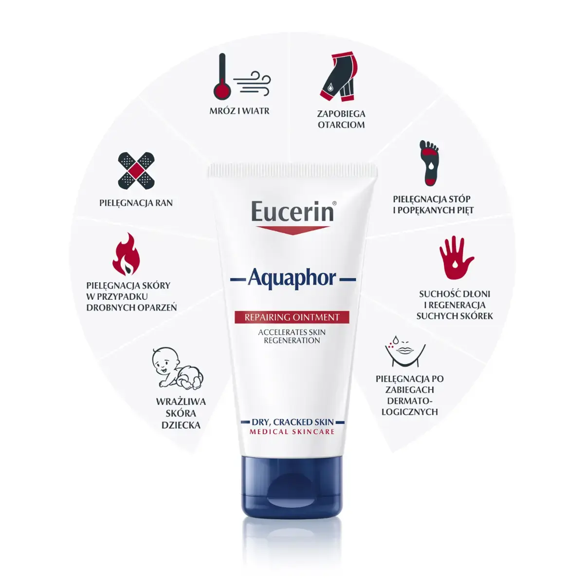 Eucerin Aquaphor Регенерирующая мазь обеспечивает необходимые, интенсивный уход для потрескавшейся, раздраженной и сухой или очень сухой кожи. Его инновационная формула без добавления воды создает на коже деликатный полуокклюзионный защитный барьер, который поддерживает естественный перенос водяного пара и кислорода к коже и от нее, позволяя ей «дышать» и укреплять свой естественный защитный барьер . Eucerin успокаивает и регенерирует кожу.