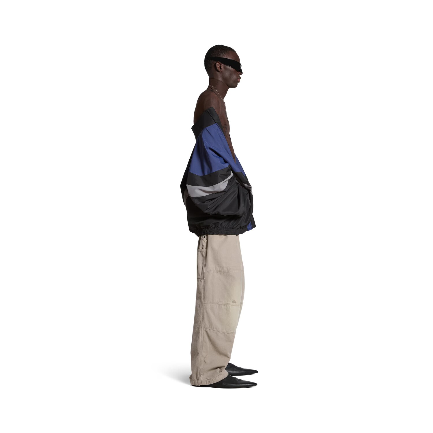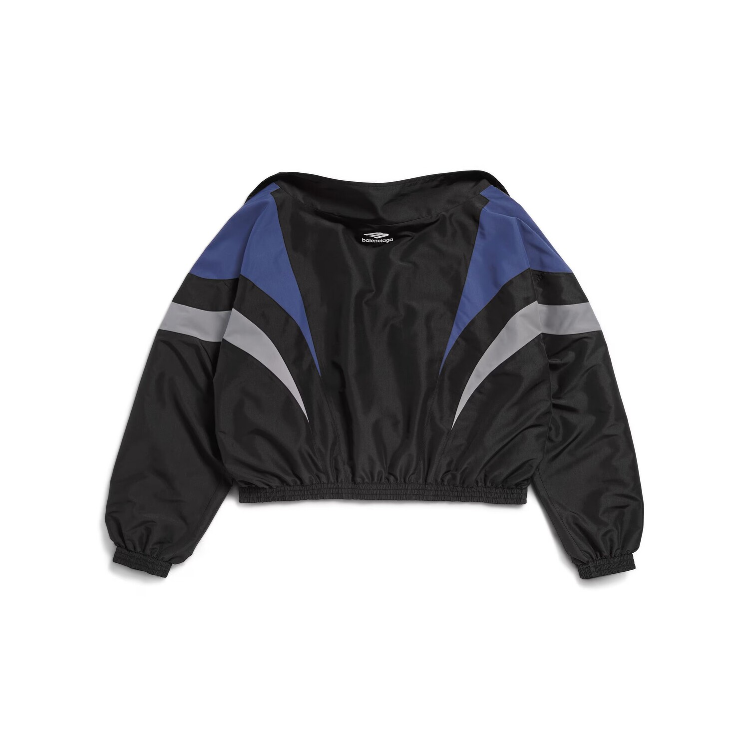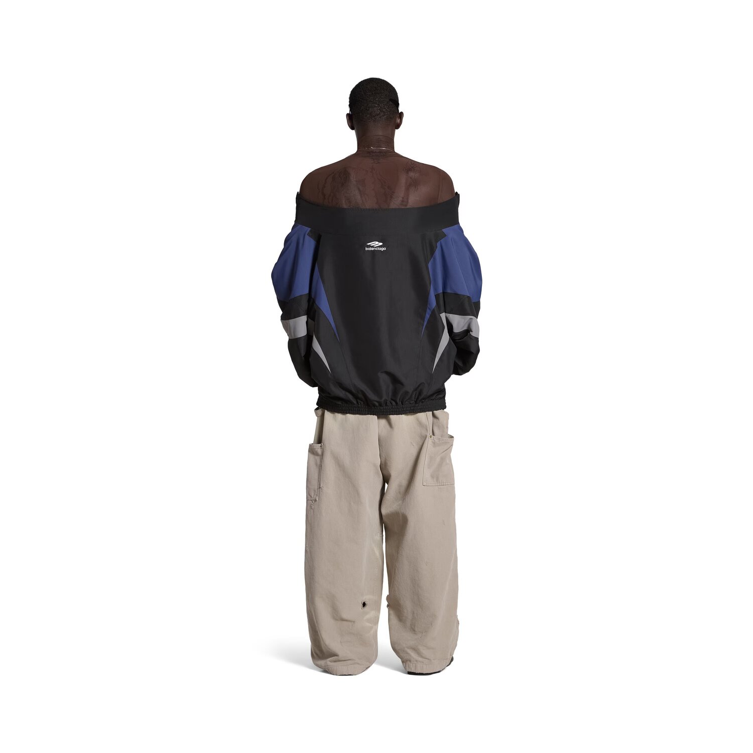 Спортивная куртка 3B Sports Icon Off Shoulder в черном, синем, сером и белом цвете из легкой технической ткани относится к образу 64 из коллекции Balenciaga Summer 24.