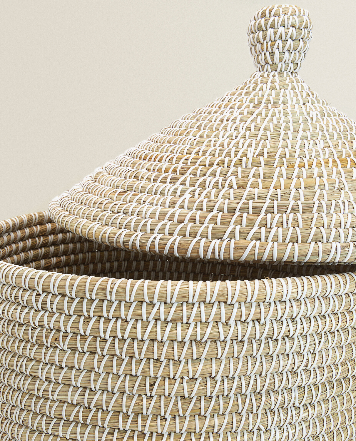 Высокая круглая плетеная корзина с крышкой для хранения белья или других предметов. Практичное декоративное изделие. В наличии два размера.