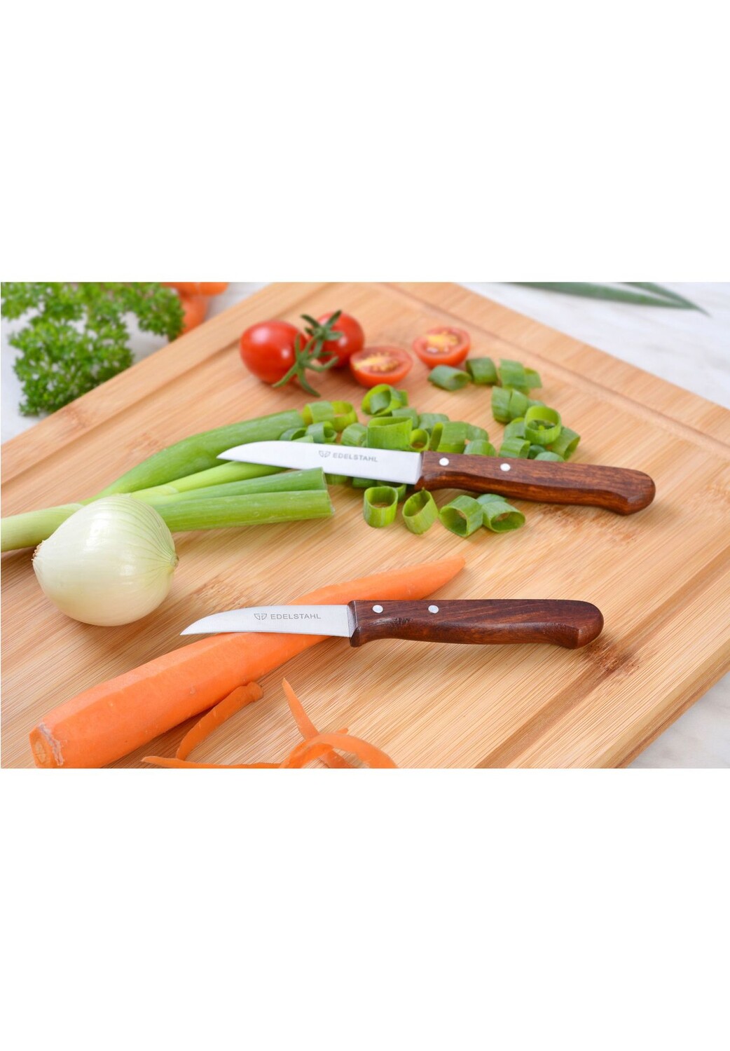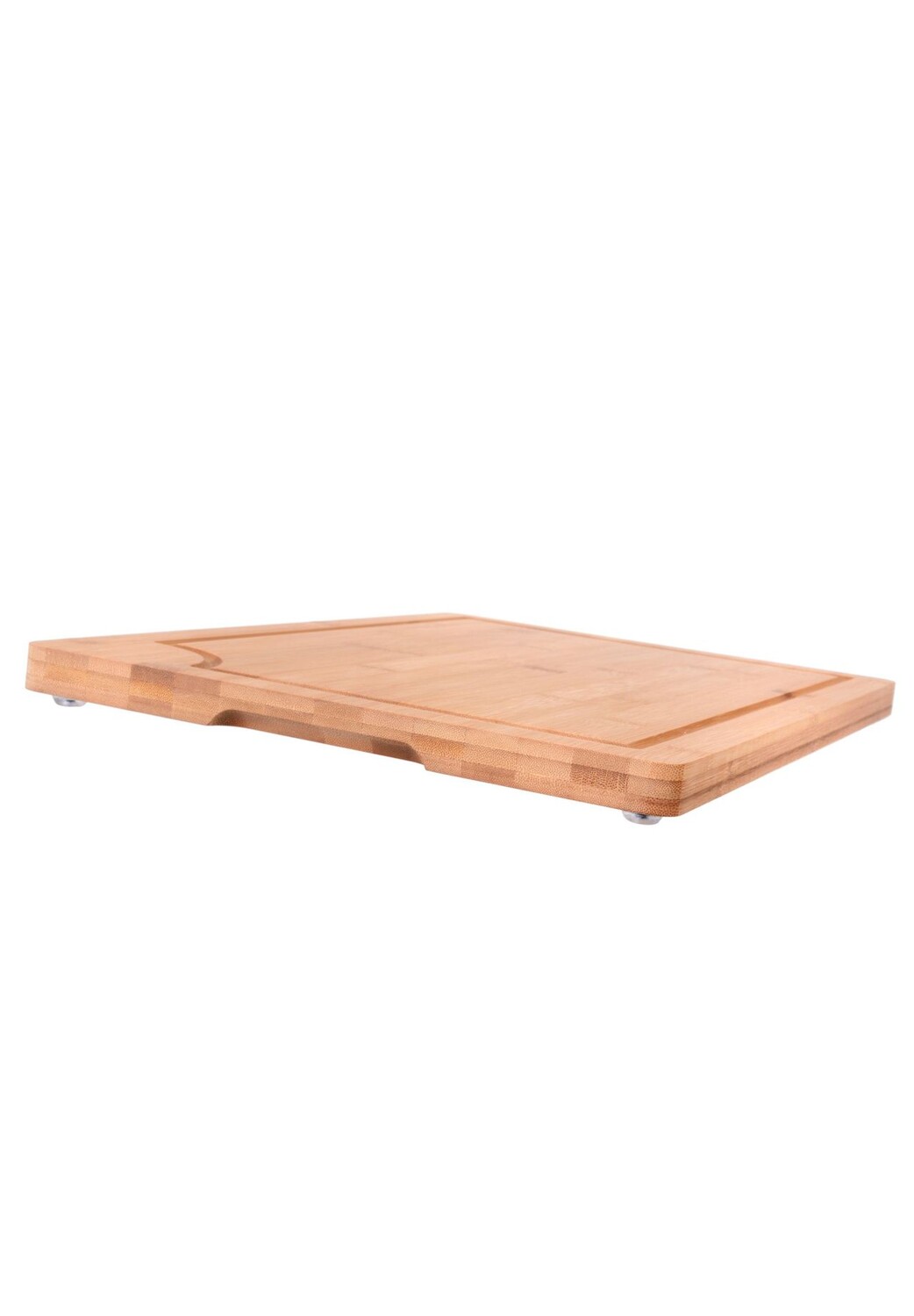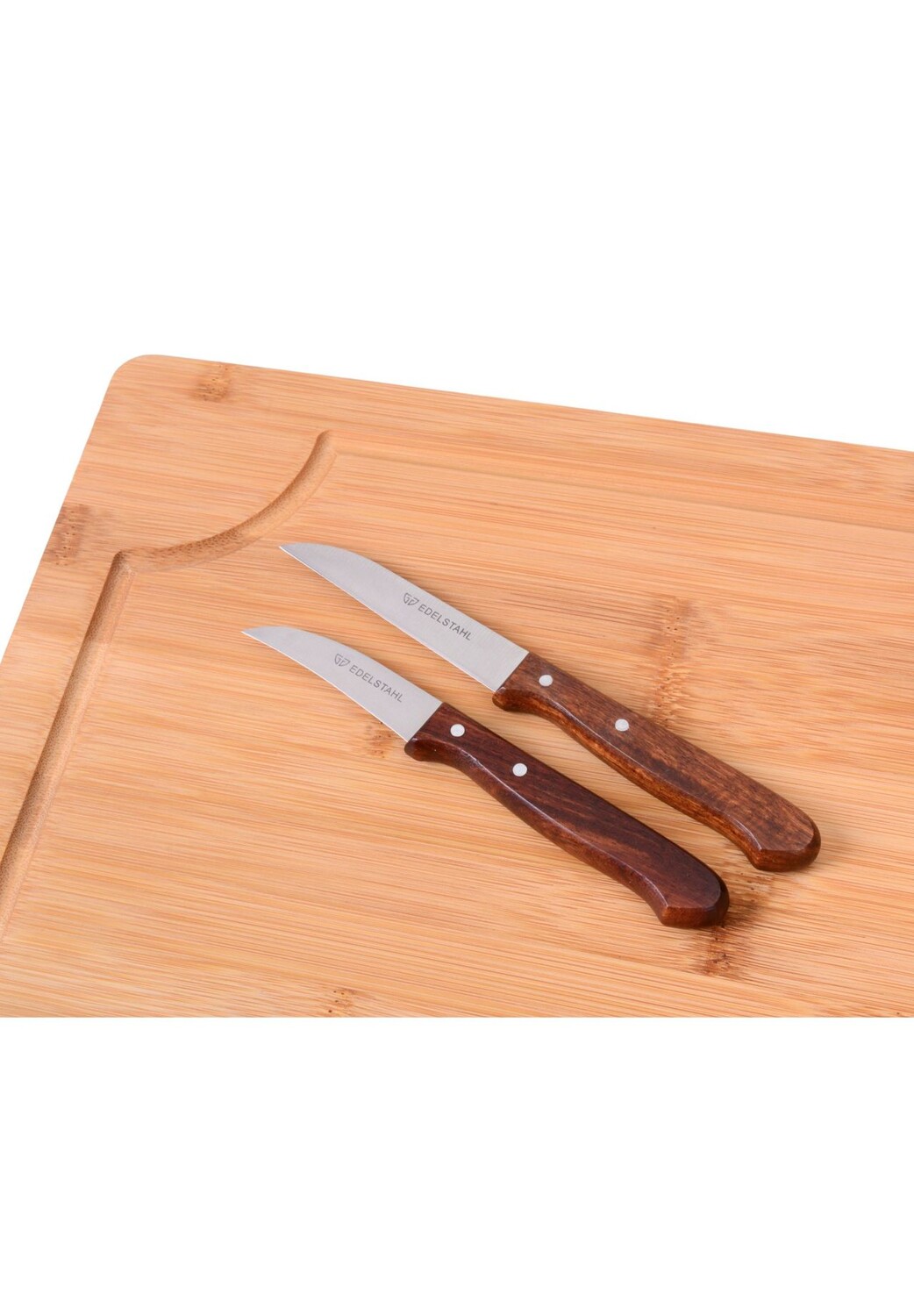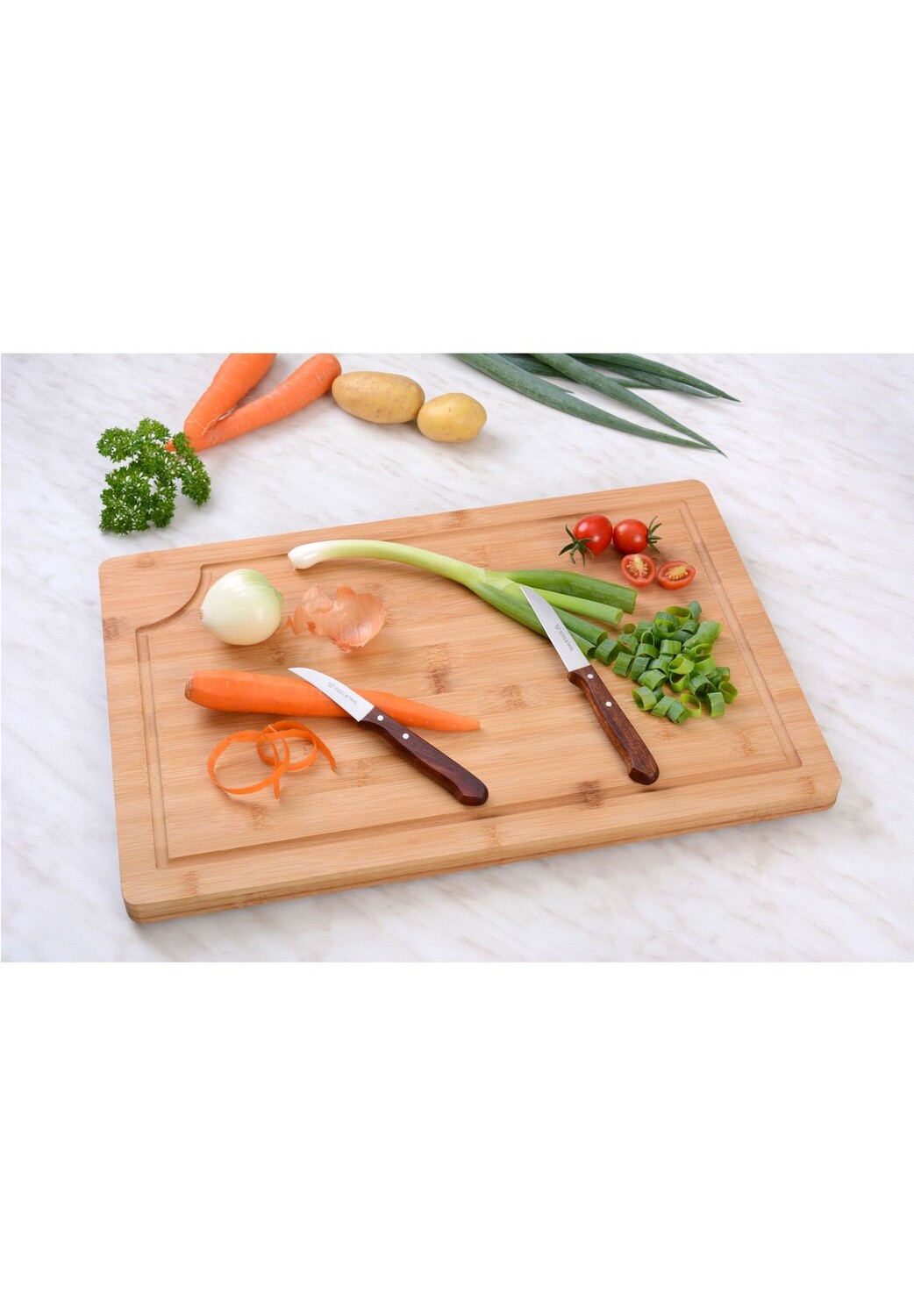 Описание товара: Разделочная доска с натуральным зерном бамбуковой травы щадит лезвия ножей и подходит для нарезки самых разных продуктов, таких как фрукты, овощи или мясо. Доска слегка закруглена и имеет желобок для сока. Комплект дополняют подходящие кухонные ножи с деревянными ручками, каждый с прямым и изогнутым лезвием. Комплект поставки: 1 бамбуковая разделочная доска + 2 шт. Размеры набора ножей: Разделочная доска: Д х Ш х В около 45 х 30 х 2,6 см, внутренние размеры до желоба для сока / режущей поверхности ок. 39 х 24 см, ширина желоба для сока ок. 10 x 1,5 см, вес ок. 1,7 кг. Нож: прямое лезвие: длина ок. 18 см, длина лезвия ок. 1 мм, вес ок. 22 г, изогнутое лезвие: ок. 16 см, длина лезвия ок. 6 см, толщина лезвия ок. 1 мм, вес ок. 20 г
