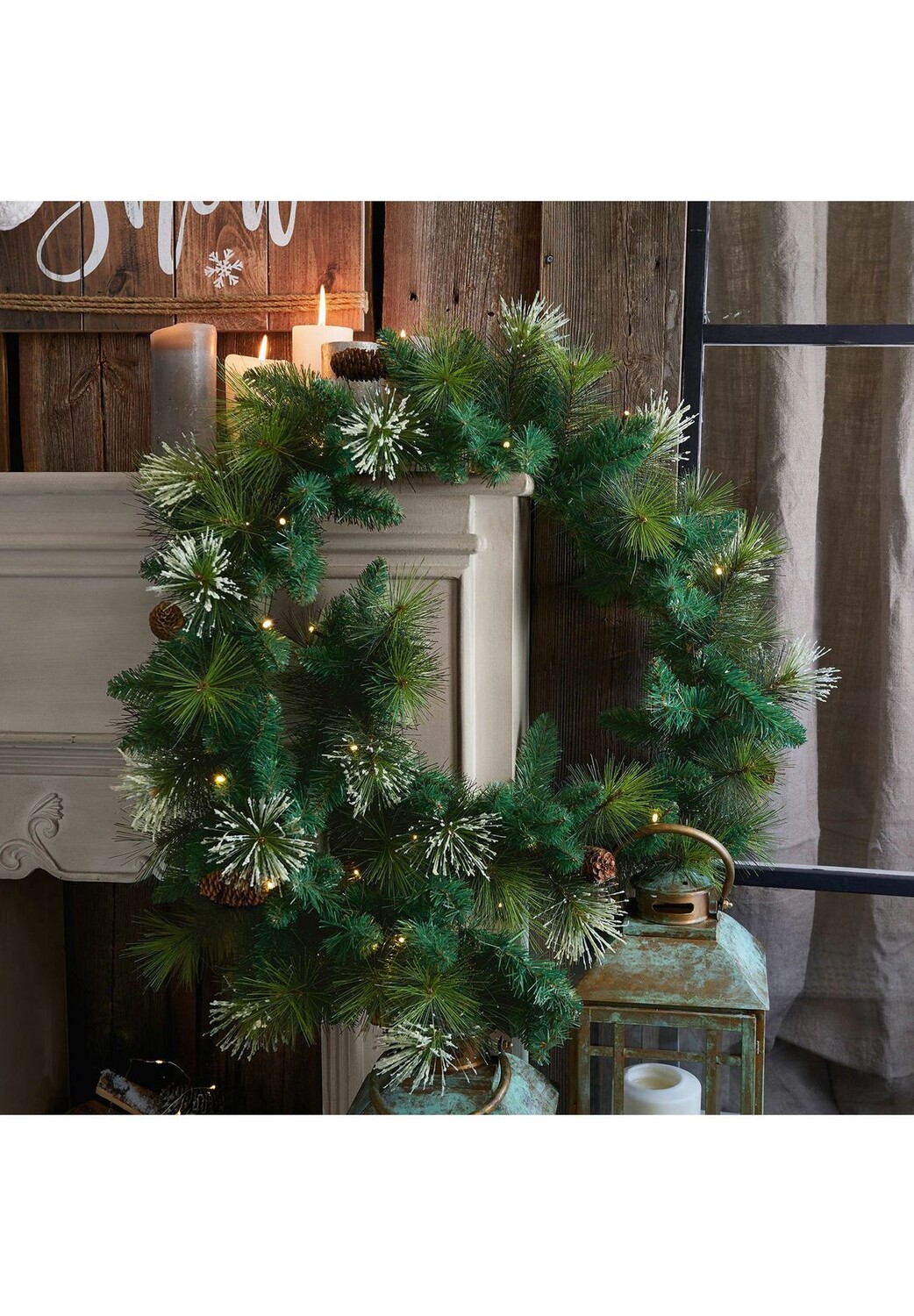 Описание товара: Очень естественный вид с настоящими конусами. Встроенная гирлянда из 30 светодиодов. Запорошено хлопковым снегом. Это означает, что впечатляюще длинную гирлянду можно легко задрапировать где угодно, без каких-либо раздражающих кабелей. 30 светодиодов обеспечивают уютный свет. Оно похоже на что-то найденное в зимнем лесу и напоминает ароматные хвои под снегом. Абсолютно атмосферный рождественский дизайн, который отлично смотрится на двери, вокруг камина или на лестничных перилах. Хранится вечно, зеленая и свежая, без потери хвои — ​​идеальный аксессуар для созерцательных моментов. С его помощью вы можете вернуть рождественский лес домой.