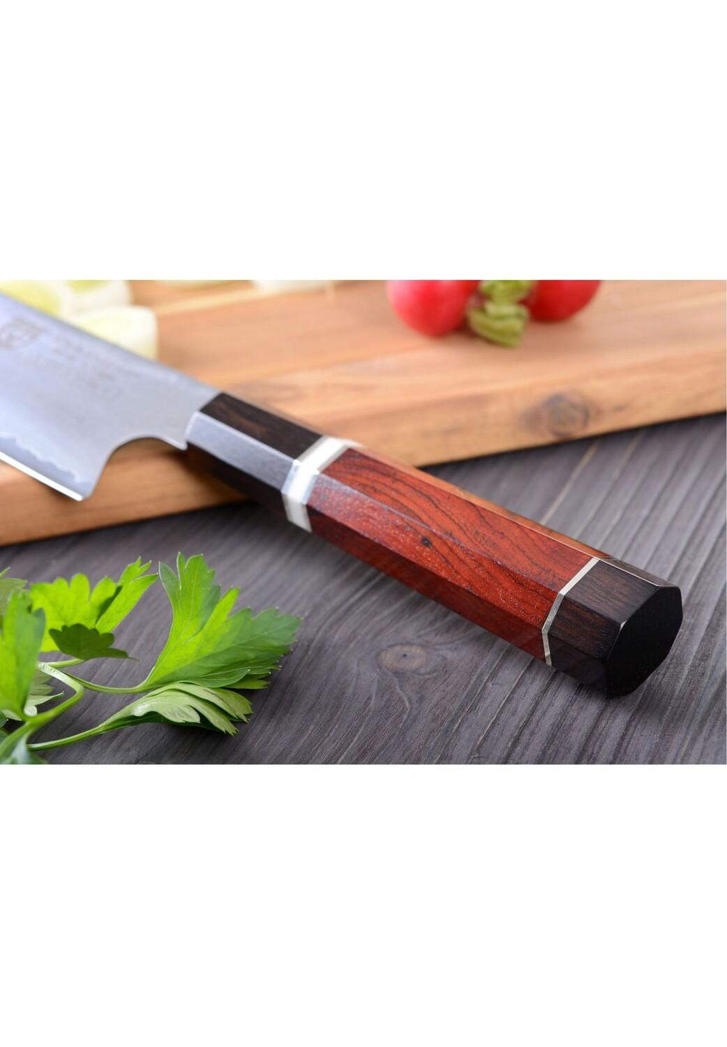 Описание предмета: Впечатляющий поварской нож из специальной углеродистой стали со слоями дамасской стали и эффектной овальной восьмиугольной ручкой. В комплект входит деревянная накладка на нож и мягкая ткань для чистки лезвия. Комплект поставки 1 Дамасский поварской нож + защита лезвия Общая длина. около 35 см, длина лезвия около 20,7 см, толщина лезвия около 2 мм, вес около 182 г Подарочная коробка: Д x Ш x В примерно: 39 x 15,5 x 3,6 см