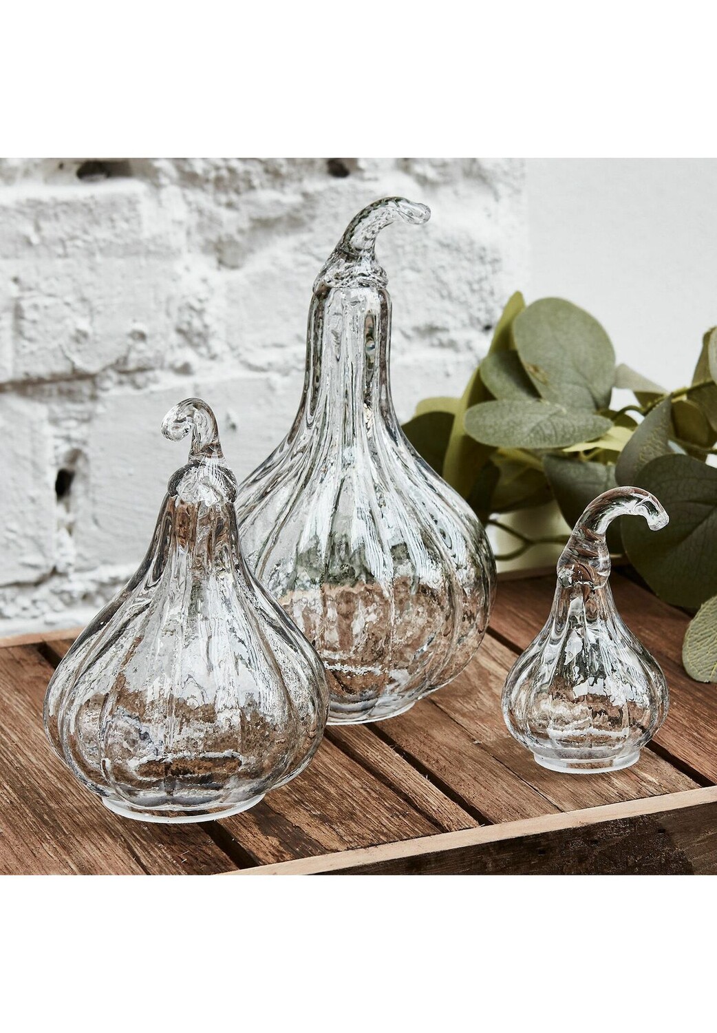 Описание предмета: детализированные стеклянные тыквы. Откройте внизу, чтобы разместить украшения или гирлянды. Ностальгическое трио в трех размерах. Здесь тыква интерпретируется совершенно по-новому – стеклянная фурнитура представляет популярный осенний аксессуар в совершенно новом облике. Тыквы имеют естественную форму и могут быть украшены очень гибко и разными способами. В чистом виде или в сочетании со свечами и осенними находками создается очаровательный акцент. В качестве украшения стола или буфета они создают уютную атмосферу дома и являются вневременным украшением любого стиля жизни.