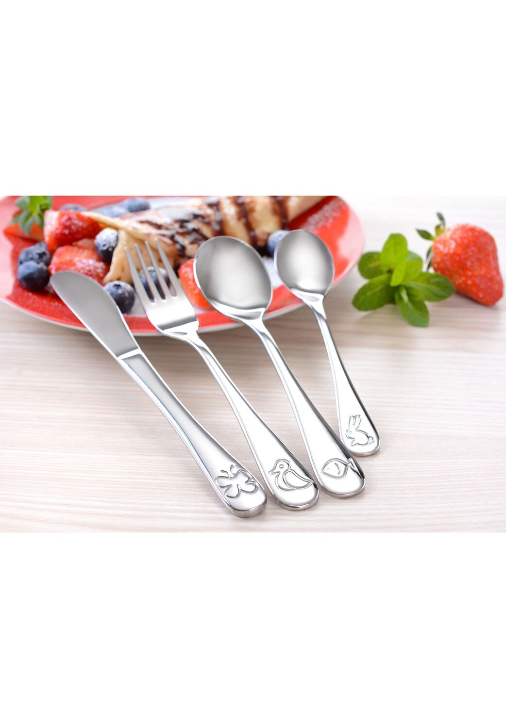 Описание предмета: превратите зоопарк в свой дом. На каждом столовом приборе тиснены различные мотивы мелких животных. На ноже изображена милая бабочка, на вилке — маленькая уточка, на ложке — рыбка, а на маленькой детской ложке — милый кролик. Ручка, специально разработанная для детских рук, благодаря своей прочности хорошо ложится в любую руку. Столовые приборы изготовлены из высококачественной нержавеющей стали 18/10 (ножи с содержанием хрома 13%) и затем отполированы вручную. Их можно полностью мыть в посудомоечной машине. Комплект поставки: - 1 нож с зубчатым краем длиной ок. 17,8 см, вес: ок. 47 г – длина 1 вилки ок. 16,5 см, толщина ок. 2,5 мм – длина 1 ложки ок. 16 см, толщина ок. 2,5 мм – длина 1 маленькой ложки ок. 14 см, толщина ок. 2 мм Поставляется в коробке с печатным рисунком, поэтому идеально подходит в качестве подарка на день рождения. Подходит для крещения или просто между ними.