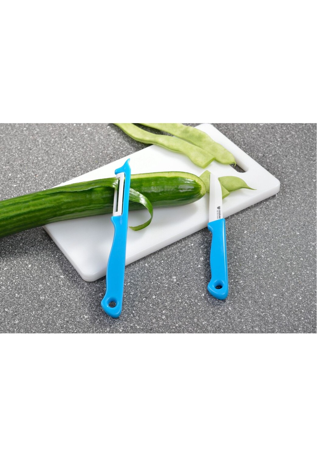 Описание товара: Красочный набор из 2 предметов, состоящий из кухонного ножа и овощечистки с керамическими лезвиями и яркими пластиковыми ручками для повседневной резки фруктов и овощей. Комплект поставки: 1 кухонный нож: длина ок. 17,5 см, лезвие ок. 7,5 см, вес ок. 20 г. 1 овощерезка: длина ок. 18 см, длина лезвия ок. 5 см, вес ок. 20 г.