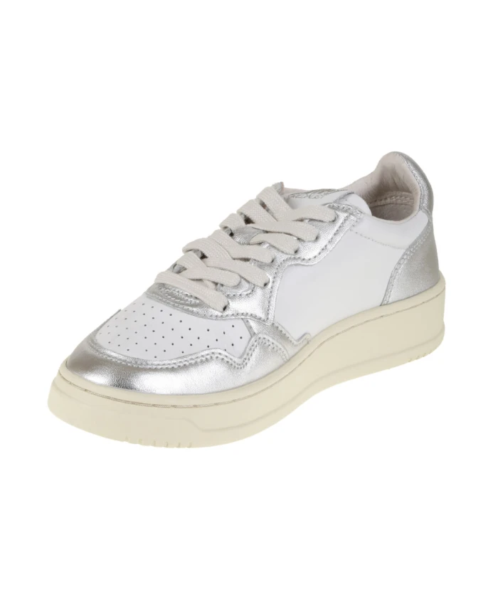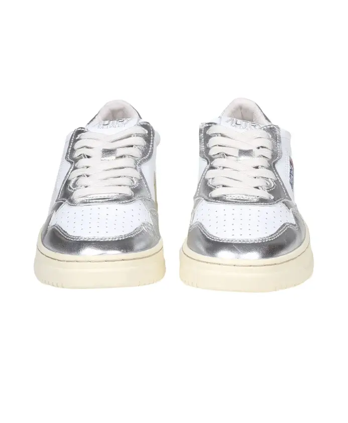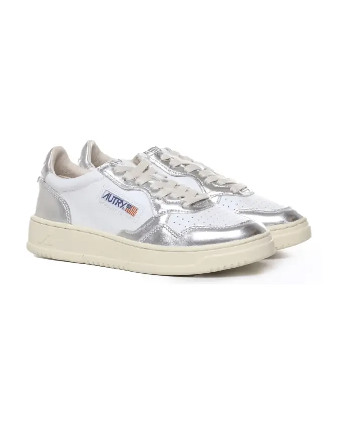 Подчеркните свой стиль кроссовок с помощью этих бело-серебристых низких кроссовок Autry 'Medalist'. Эти стильные и удобные кроссовки с многослойным кожаным верхом, кожаным усилением пятки и тисненым логотипом. Шнуровка выполнена с помощью плоских хлопковых шнурков, круглого перфорированного носка и кожаного язычка с логотипом. В комплект входят мягкий воротник на щиколотке, махровая подкладка из кожи и хлопка, кожаная подошва высотой 2 см и резиновая подошва с логотипом сбоку. Высота подошвы: 2,5 – 3,5 см.