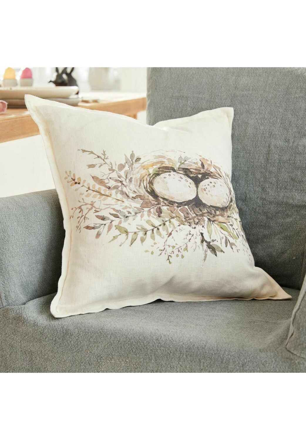 Описание товара: Художественный чехол для подушки. Высококачественная льняная ткань с красивой окантовкой по краю. С изысканным акварельным принтом. Красивый чехол на подушку, украшенный замысловатым праздничным мотивом. На искусной иллюстрации изображены два пятнистых птичьих яйца, благополучно покоящиеся в гнезде, сделанном из нежных ветвей. Естественная элегантность дизайна придаст вашему дому особую атмосферу, которая будет радовать не только Пасхой. Чехол на подушку соткан из высококачественного льна и имеет прекрасную структуру, которая очень приятна для кожи. Вот почему это хороший выбор не только для вашего любимого кресла или дивана в гостиной, но и для спальни.