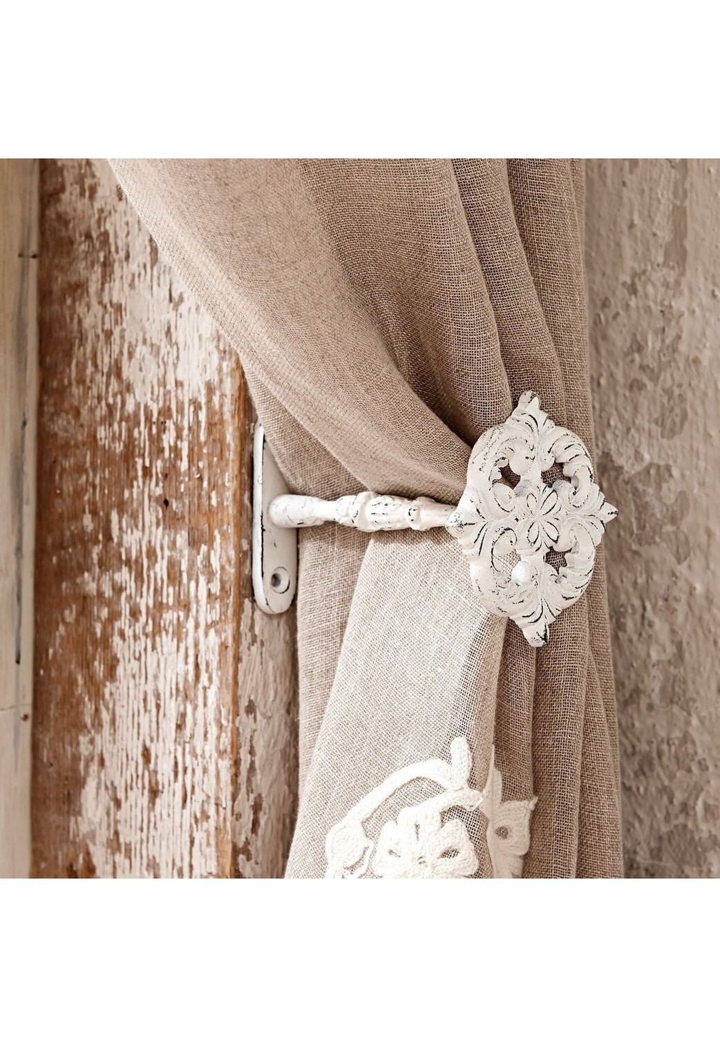 Описание товара: Невероятно изящные держатели в стиле шебби-шик. Два небольших аксессуара, которые дают достаточно места для творческих идей оформления окон! Они просто прикручиваются к стене и удерживают шторы в течение дня. Они также создают романтический акцент, особенно с соответствующим карнизом. Орнаменты в форме цветов изящно выполнены и имеют очаровательную потертую отделку. Стильное дополнение к очаровательному стилю загородного дома, которое идеально подчеркивает шторы.