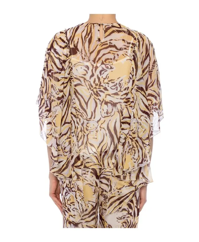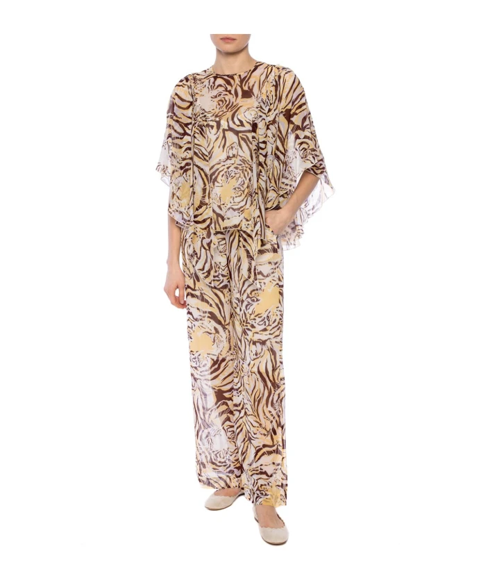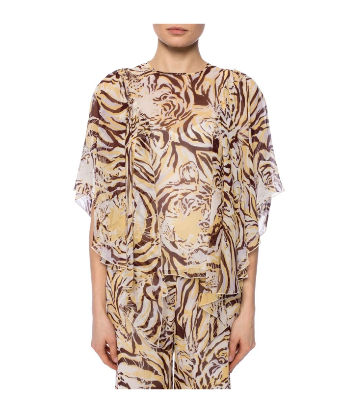 Прозрачный топ желтого, коричневого и розового цвета от See By Chloé. Украшен оборками и принтом в виде головы тигра. Круглый вырез.