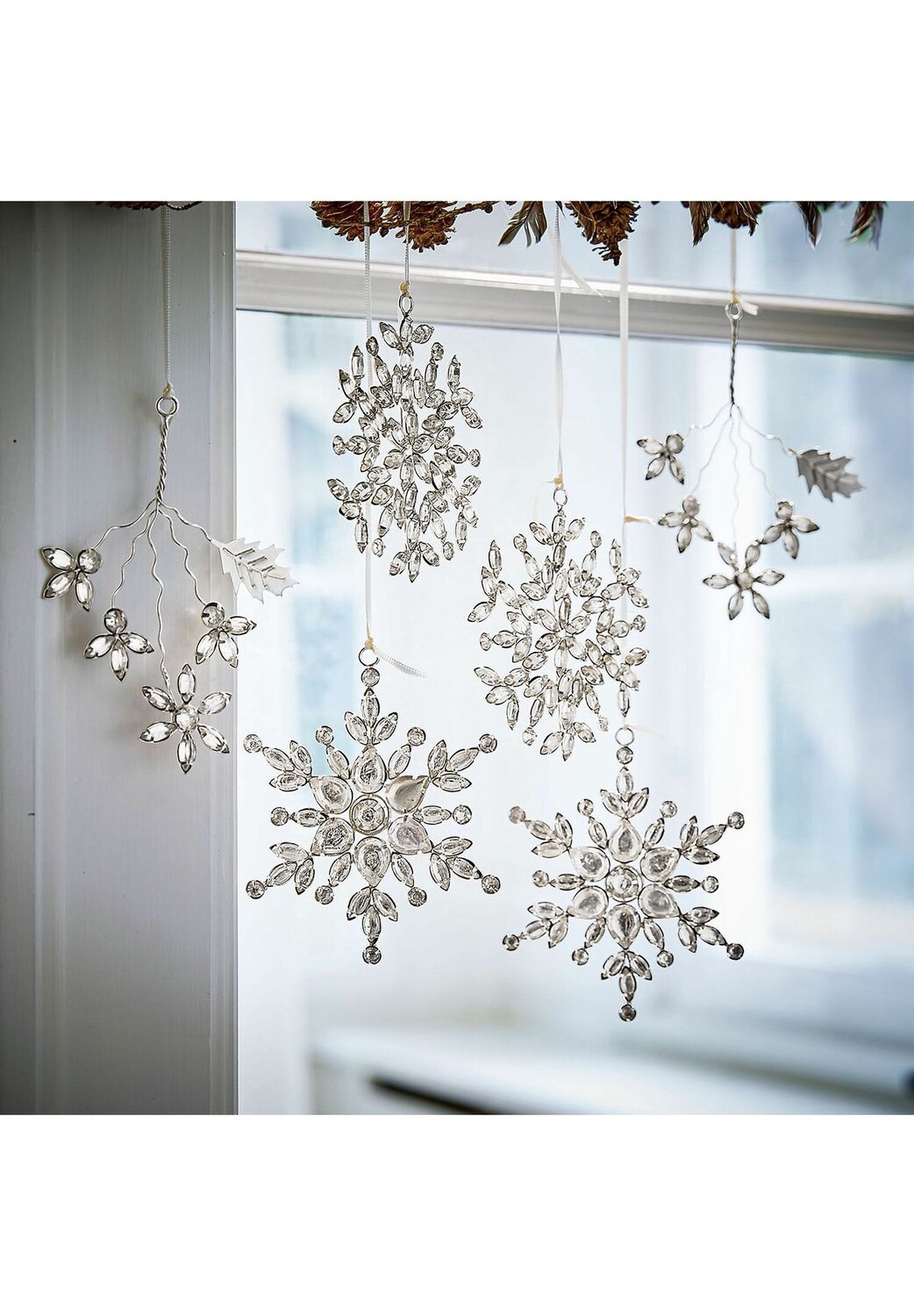 Описание предмета: Различные декоративные украшения в виде снежинок, звезд и листьев. Комплект из стеклянных камней искусной огранки. Украсьте ветки, гирлянды и т. д. Придайте своей елке блеск, которого она заслуживает в это Рождество! Этот набор украшений из шести предметов идеально подходит для созерцательных моментов и привносит элегантность зимней мечты в любую комнату вашего дома. Благодаря различным мотивам он создает непревзойденную, элегантную атмосферу, не имеющую себе равных. Высококачественные железные подвески украшены сверкающими стеклянными бусинами, которые придают им вид ценных сокровищ. Они являются прекрасным дополнением к любому типу декора и улучшают любую атмосферу. Наш совет: используйте красивые детали, чтобы украсить подарки своим близким и украсить оберточную бумагу.