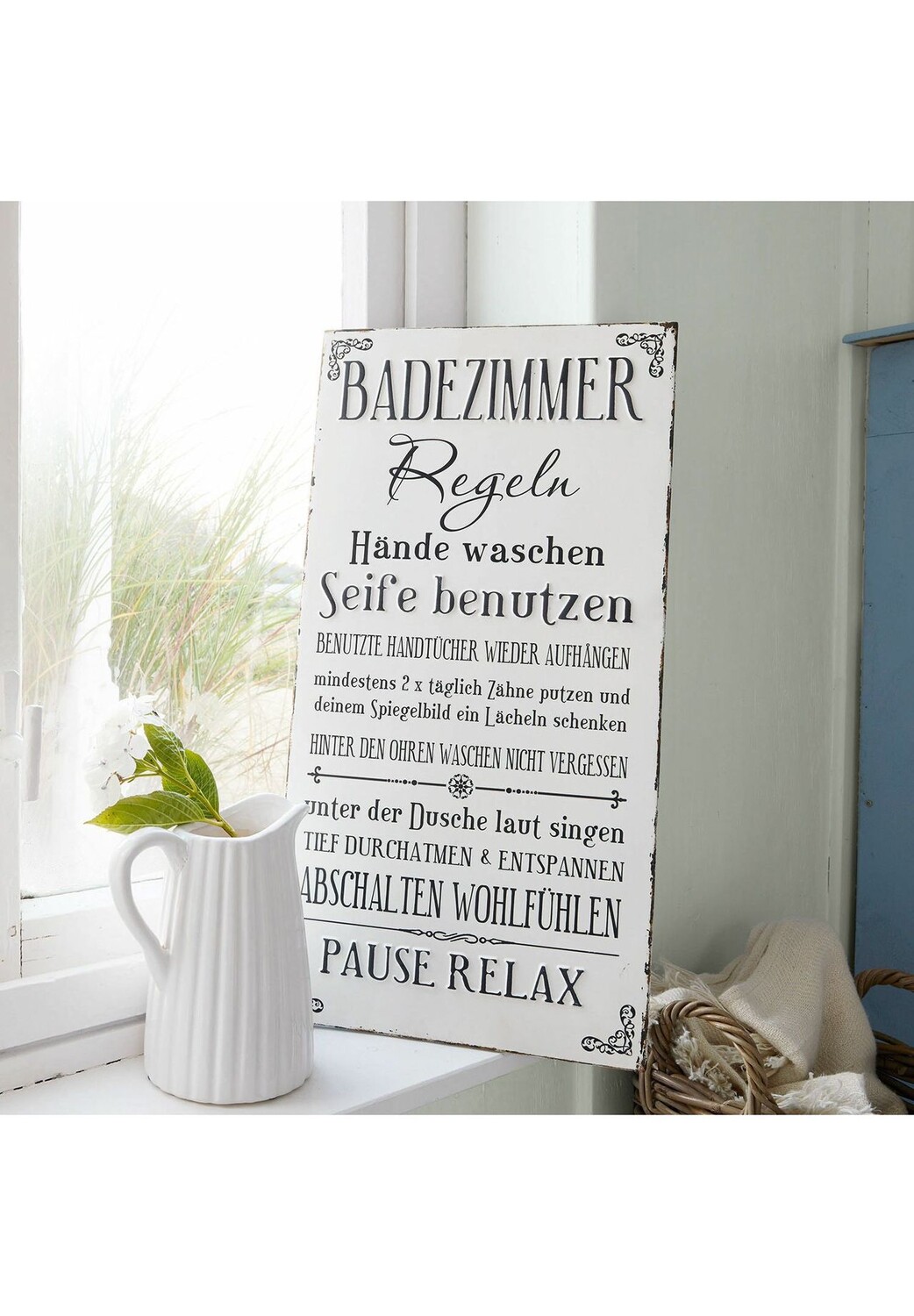 Описание предмета: высококачественный железный знак. Ностальгические надписи с тиснением. С очаровательным посланием. Вы когда-нибудь видели более очаровательное украшение стен ванной комнаты? Мы тоже! Декоративная доска изготовлена ​​из качественного железа и представляет собой небольшой каталог правил – конечно, с подмигиванием: «Мойте руки, пользуйтесь мылом». Снова повесьте использованные полотенца. Чистите зубы минимум два раза в день и улыбайтесь своему отражению в зеркале. Не забудьте помыть за ушами. Громко пойте в душе. Сделайте глубокий вдох и расслабьтесь. Выключитесь и почувствуйте себя хорошо. Перерыв. Расслабляться.' Этот знак всегда вызывает улыбку на лицах посетителей ванной комнаты и обеспечивает вневременную элегантность благодаря своему аутентичному винтажному виду.