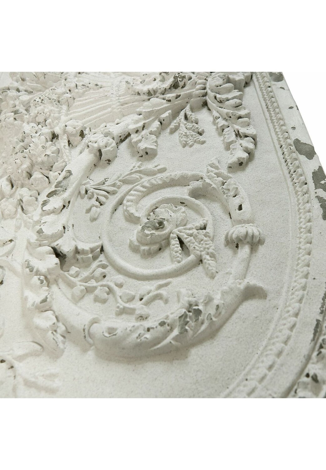 Описание предмета: Благородное украшение комнаты в орнаменте в стиле барокко. Изготовлен вручную из полирезина. С очаровательным потертым шармом. В типичном стиле барокко великолепные листья аканта и широкие волюты окружают пышный букет цветов, и возникает вопрос, из какого дворца в стиле барокко могло произойти это декоративное панно. Конечно, этот вопрос должен остаться без ответа, но это может побудить вас совершить мысленную прогулку в прошлое – возможно, в дворец удовольствий в стиле барокко, сплошь украшенный мотивами, подобными тем, что изображены на этом декоративном панно. Раньше орнаментальные мотивы выполнялись из самых разных материалов. Здесь выбор пал на современный искусственный камень из полирезина, а мелкие следы потертости придают античный характер правдоподобному. Декоративную панель можно повесить на практичные железные крючки-кольца.