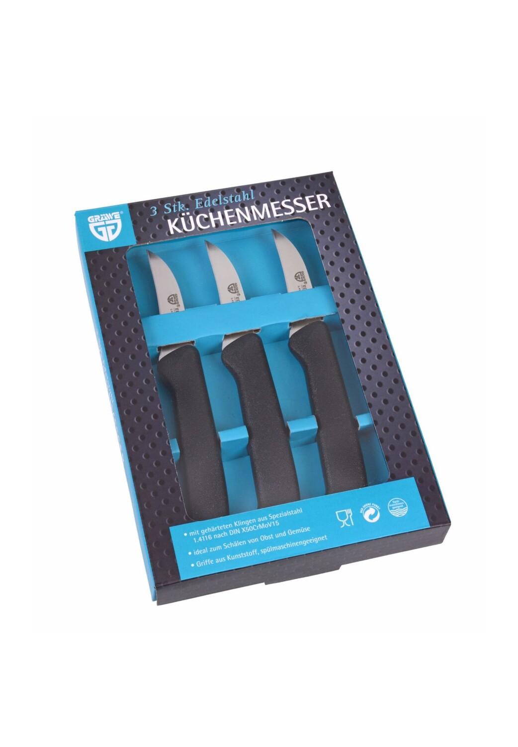 Описание предмета: Кухонный нож с цветными ручками для нарезки продуктов, например фруктов и овощей. Лезвие изготовлено из нержавеющей стали 1.4116, ручки из пластика. Комплект поставки: 3 кухонных ножа с ручками. Длина: ок. 16,3 см, длина лезвия ок. 6 см, вес (1 нож) ок. 25 г.