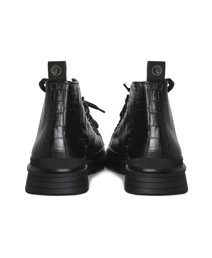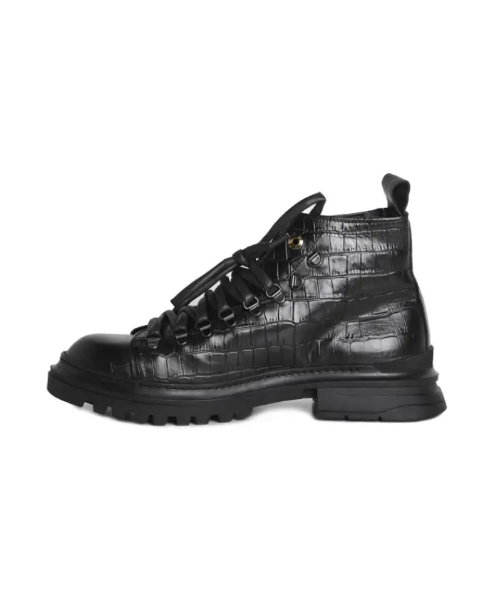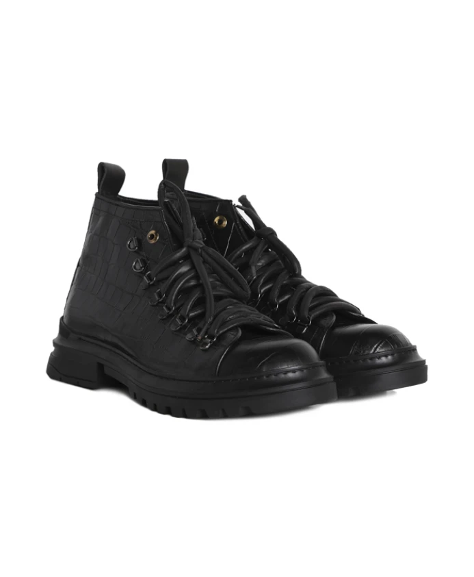 Подчеркните свой стиль с помощью этих черных ботинок Giuliano Galiano. Эти ботинки на шнуровке из натуральной телячьей кожи украшены модным крокодиловым принтом, создающим элегантный образ. Широкие шнурки в тон придают современный вид классическому дизайну, а резиновая подошва слегка большего размера обеспечивает комфорт и долговечность. Эти ботинки, изготовленные в Италии, станут идеальным дополнением для любого мужчины, следящего за модой.