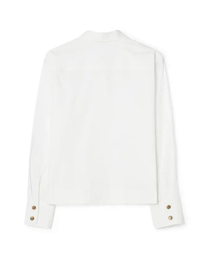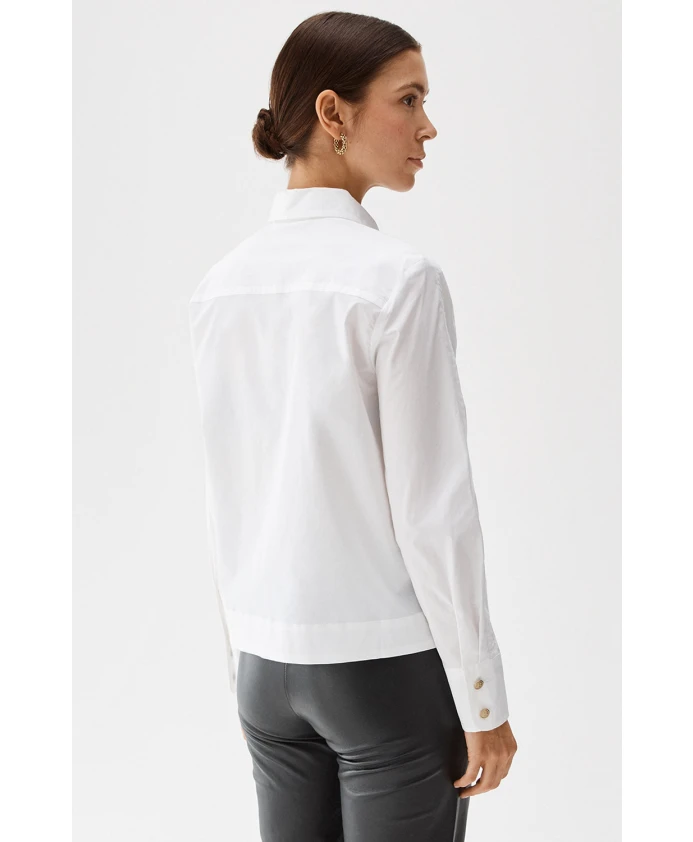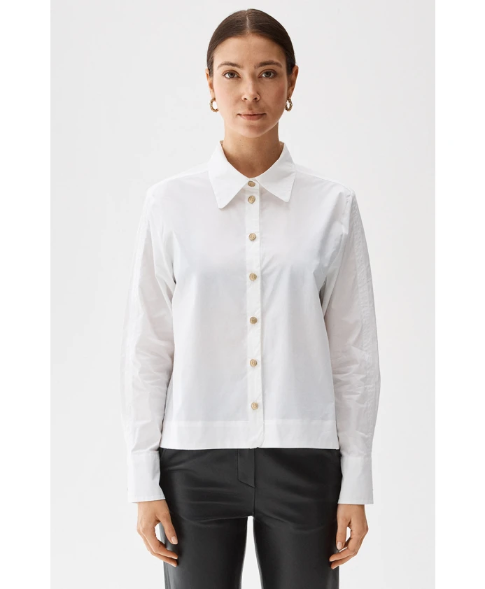 Рубашка Noomi — идеальная базовая вещь на все случаи жизни. Он имеет более короткую квадратную форму и украшен шестью золотыми пуговицами B спереди и по две на манжетах. Носите это изделие с юбкой, например, с юбкой Alina, или с любимыми джинсами. Ткань: 97 % хлопок, 3 % эластан. Машинная стирка при 30 градусах. Соответствует размеру, берите свой обычный размер. Рост модели 177 см, размер 38. Размеры этого изделия см. здесь. Сделано в Португалии.