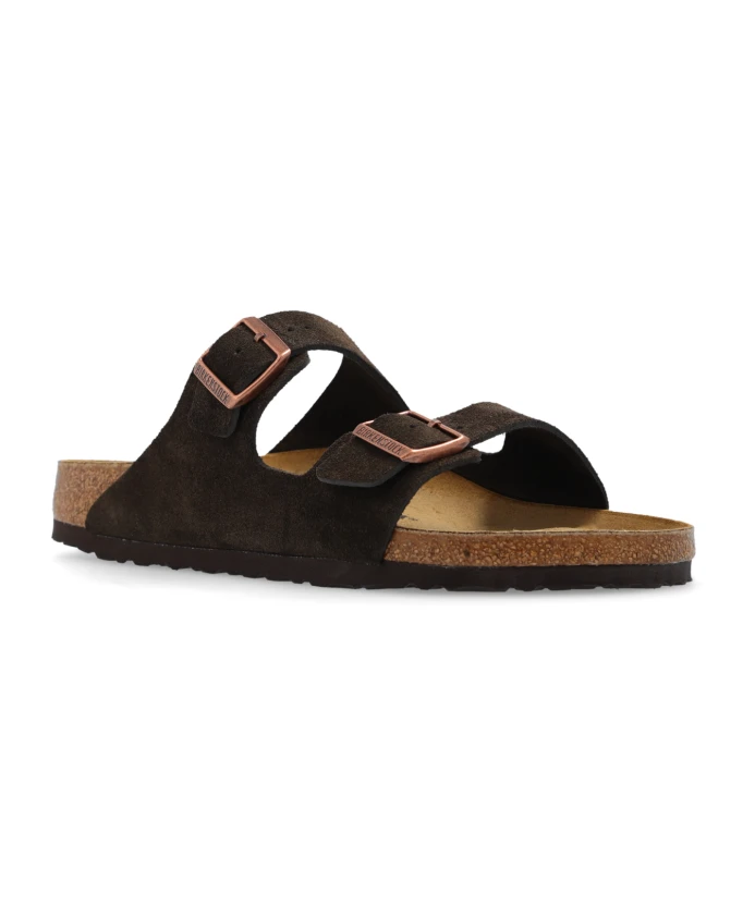 Темно-Коричневые сандалии Arizona BS от Birkenstock. Эта модель, выполненная из замши, имеет темно-коричневую подошву из пеноматериала ЭВА, стандартную ширину, стельку из пробкового латекса анатомической формы, регулируемые ремни с пряжками и тисненый логотип сбоку. Высота подошвы: 2 см.