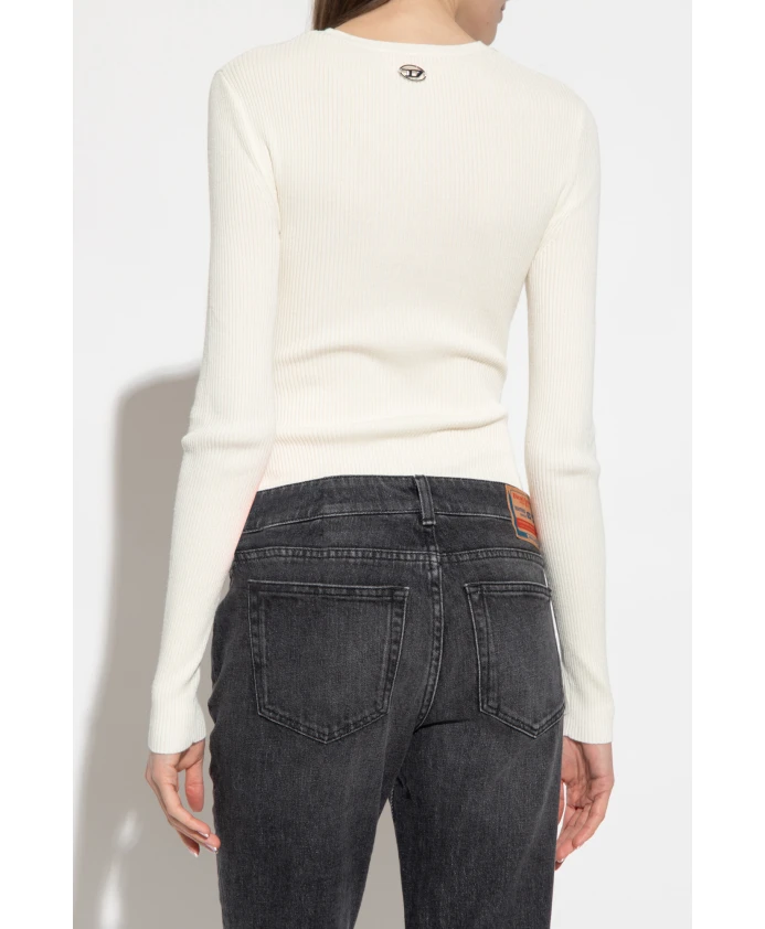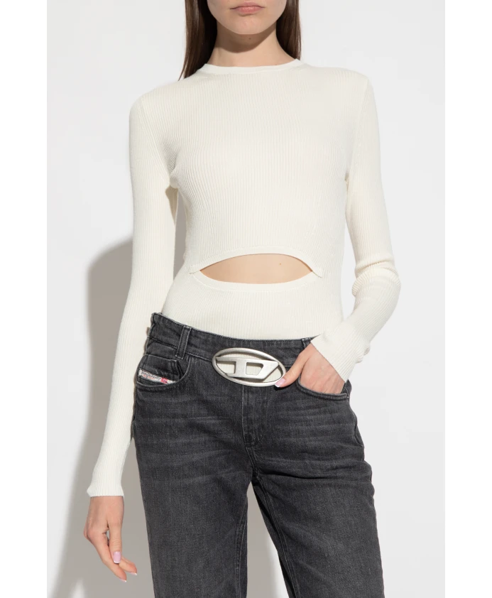 Кремовый топ M-PERIS от Diesel. Эта модель из ребристой смесовой шерсти имеет приталенный силуэт, вырез спереди, серебристую фурнитуру с логотипом сзади, длинные рукава и эластичный круглый вырез. Размеры модели: Рост: 176 см. Грудь: 85 см. Талия: 60 см. Бедра: 89 см. На модели размер: XS.