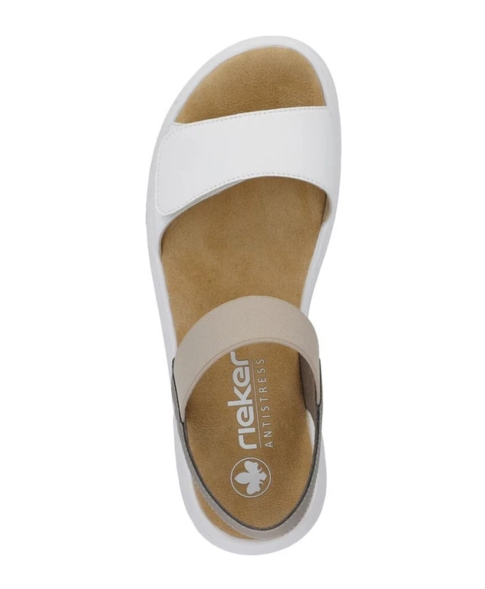Создайте стильный образ с этими женскими сандалиями на плоской подошве Rieker белого цвета. Изготовлен из кожаного верха и текстильной подкладки. продукт
