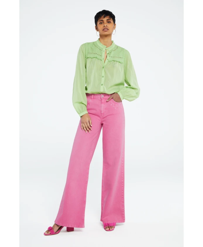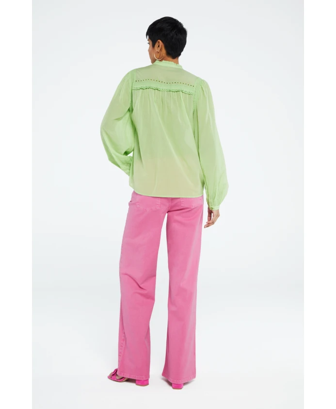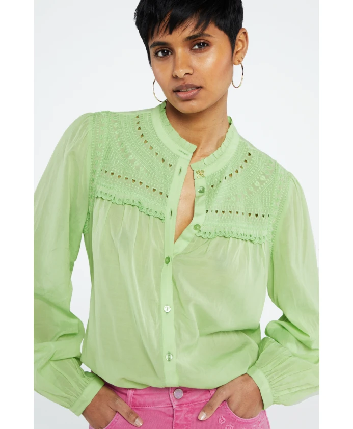 Зеленая блузка с воротником-стойкой с рюшами и золотистой пуговицей Fabienne Chapot, характерной для модели. Блузка Tootsie украшена стильными деталями Ajour в области груди.