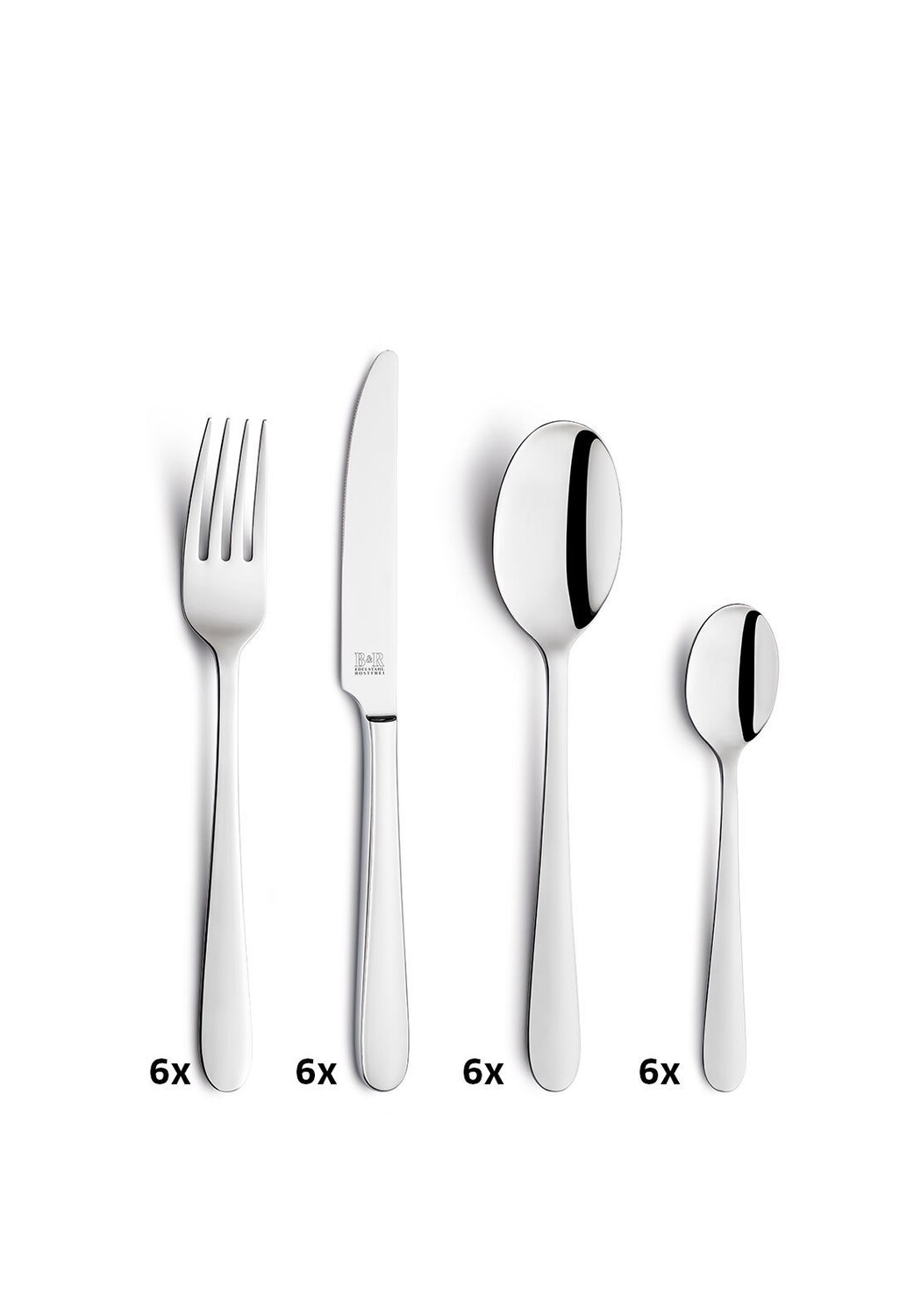 Комплект поставки: 6 кофейных ложек, 6 столовых вилок, 6 столовых ложек, 6 столовых ножей