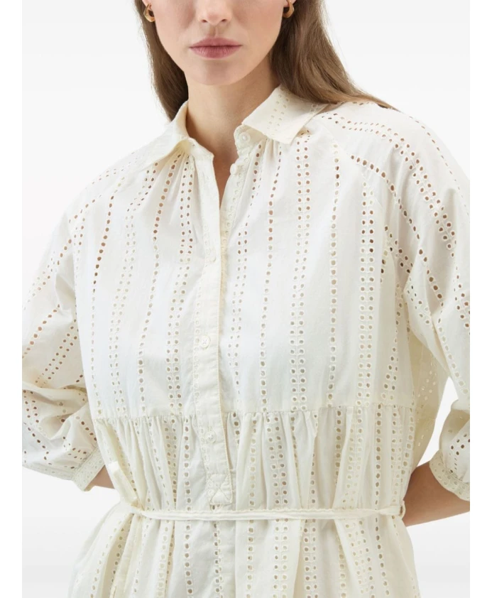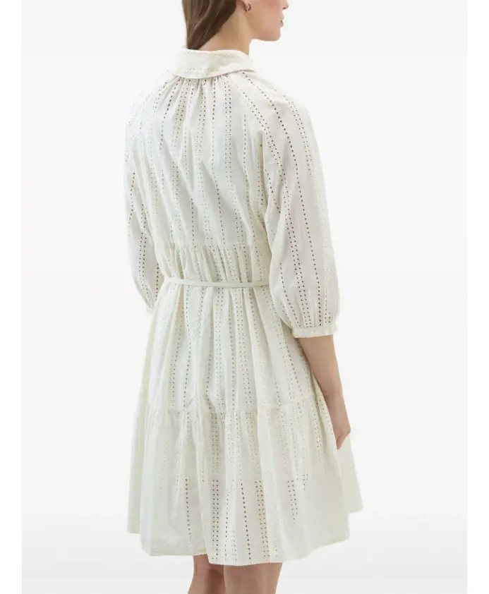 Платье-Рубашка Woolrich из хлопкового шитья английской вышивки цвета экрю сделает ваш повседневный образ более изысканным. Это платье длиной выше колена с расклешенным воротником, пуговицами спереди, пышными рукавами длиной три четверти, завязкой на талии, многоярусной юбкой и прямым подолом идеально подходит для любого случая. Верный размер. Рост модели 1,75 м / 5 футов 8 дюймов, носит размер S.