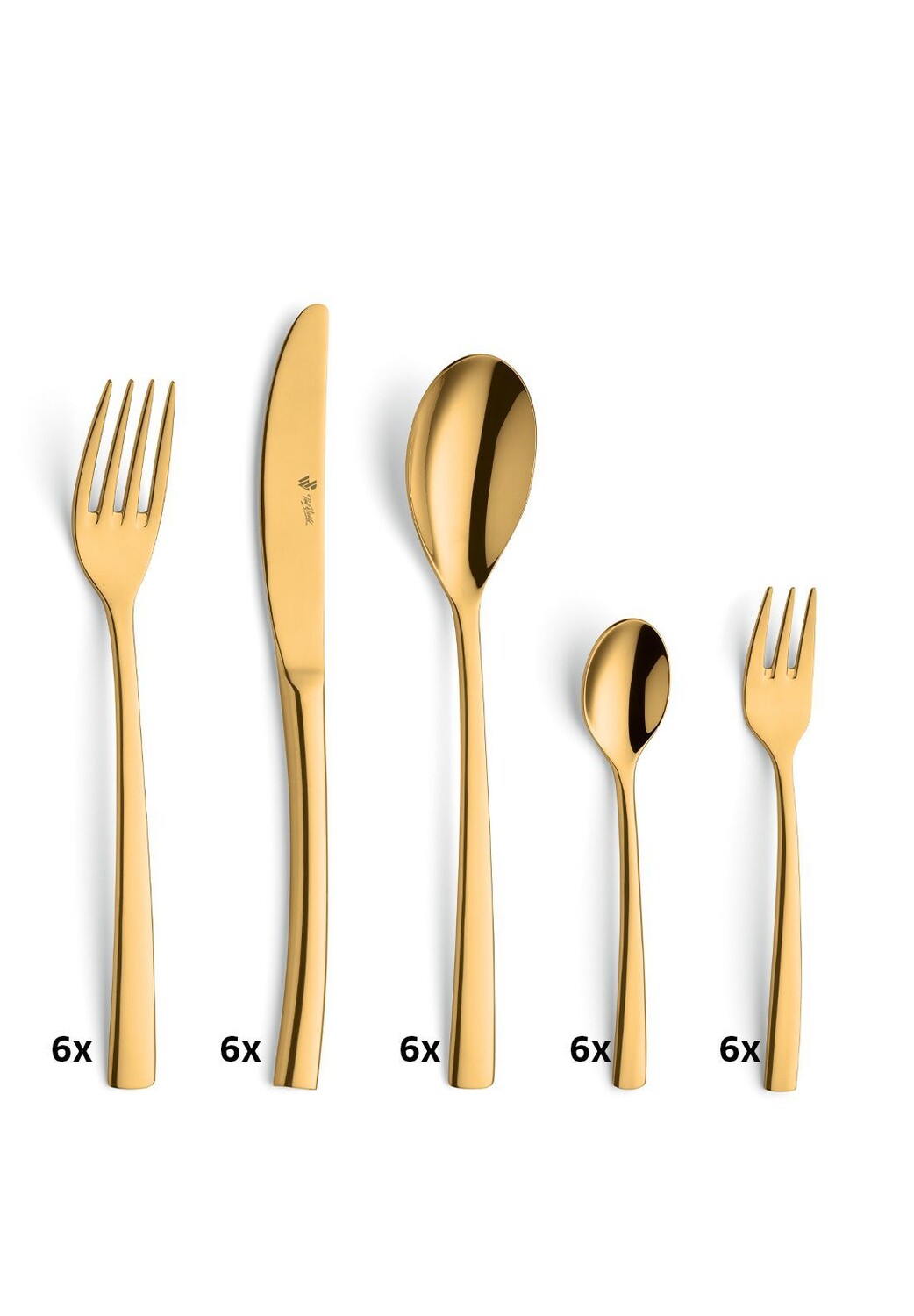 Комплект поставки: 6 кофейных ложек, 6 вилок для торта, 6 обеденных вилок, 6 столовых ложек. 6 ножей для меню