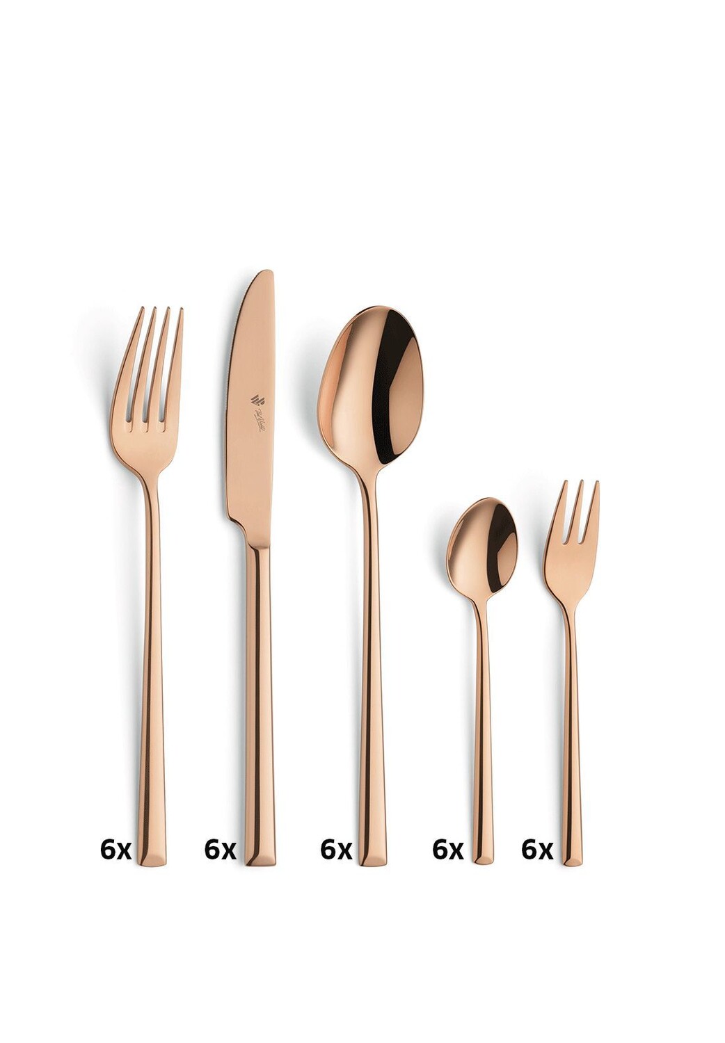Комплект поставки: 6 кофейных ложек, 6 вилок для торта, 6 столовых вилок, 6 столовых ложек, 6 столовых ножей.