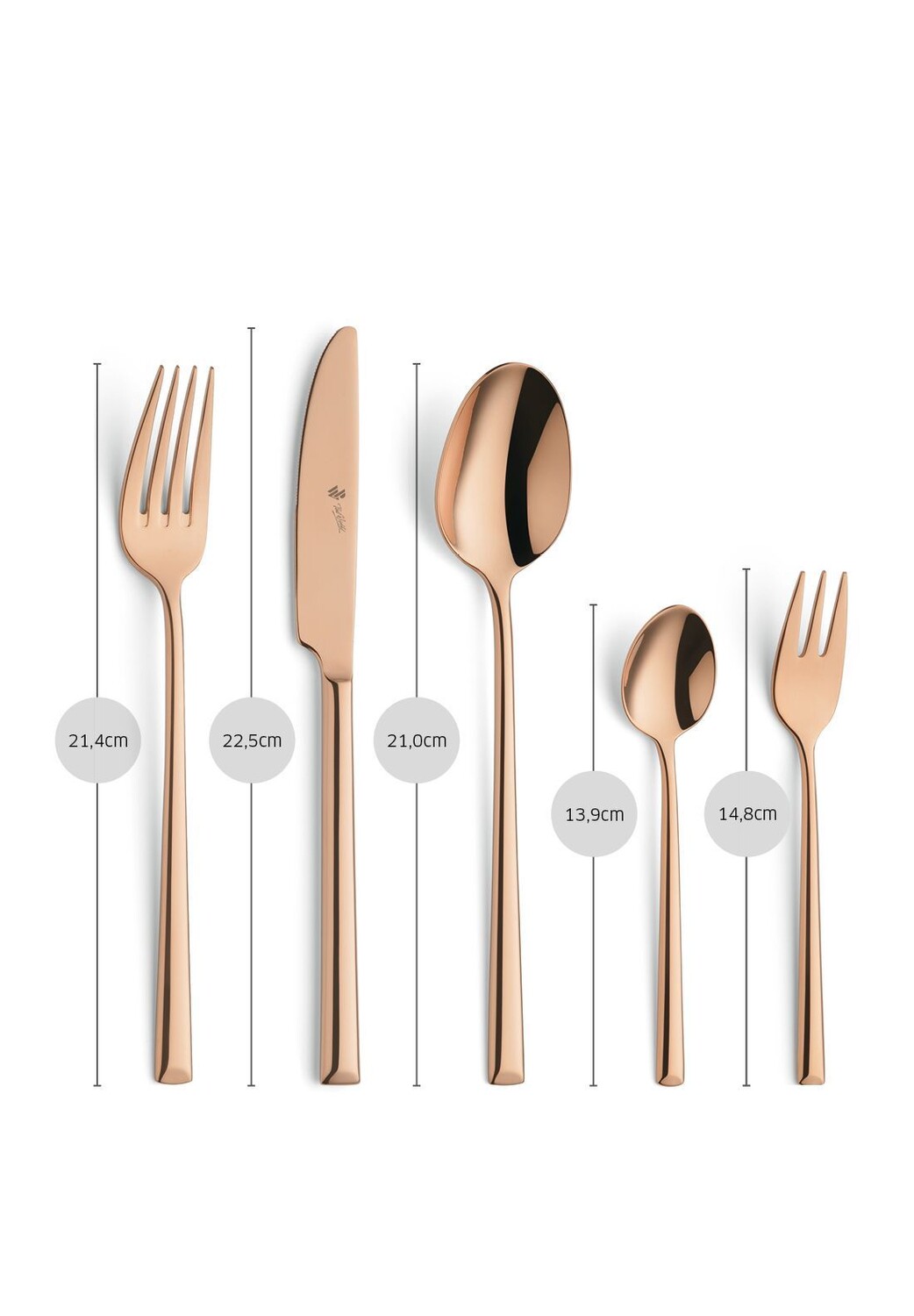 Нержавеющая сталь 18/10, полированная медь. Рекомендуется ручная стирка. В футляре.