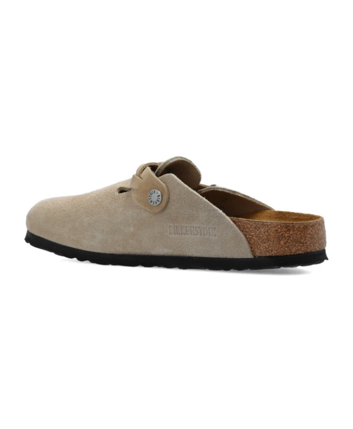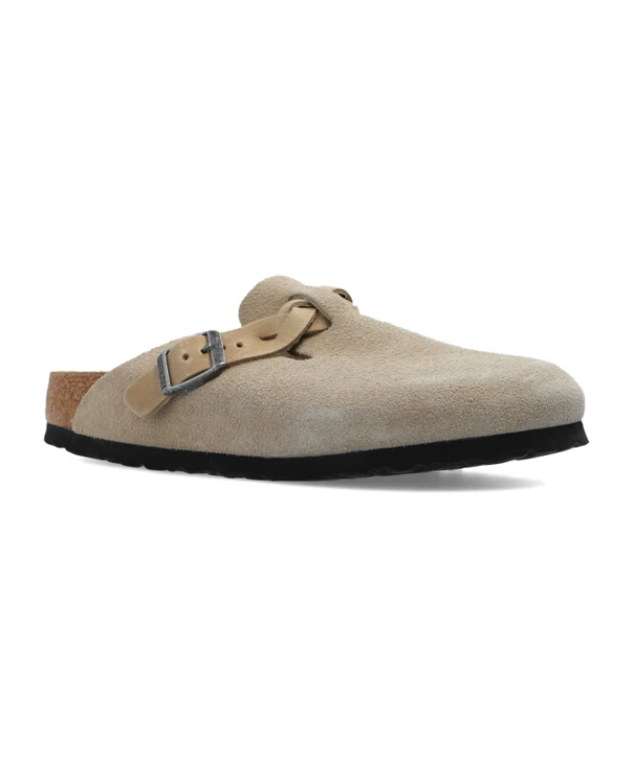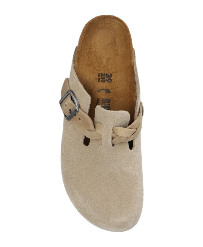 Подчеркните свой повседневный образ с помощью этих серо-коричневых плоских сабо Birkenstock «Boston Braided». Верх из мягкой замши, слипоны и стелька из пробкового латекса анатомической формы. Плетеный ремешок с узором и индивидуально регулируемая серебристая металлическая пряжка. Идеально подходит современной женщине. Размер и посадка: Маленькая, узкая ширина.
