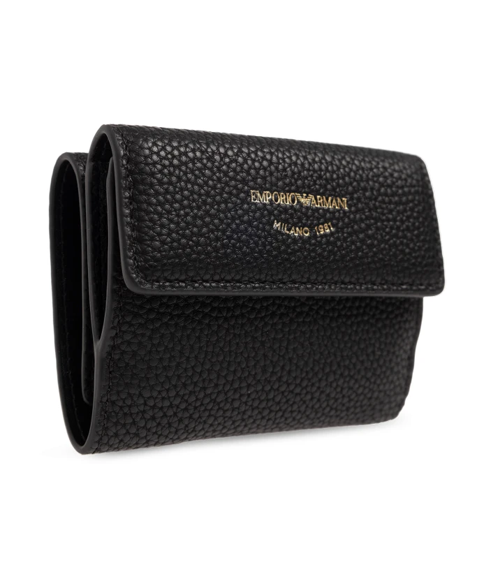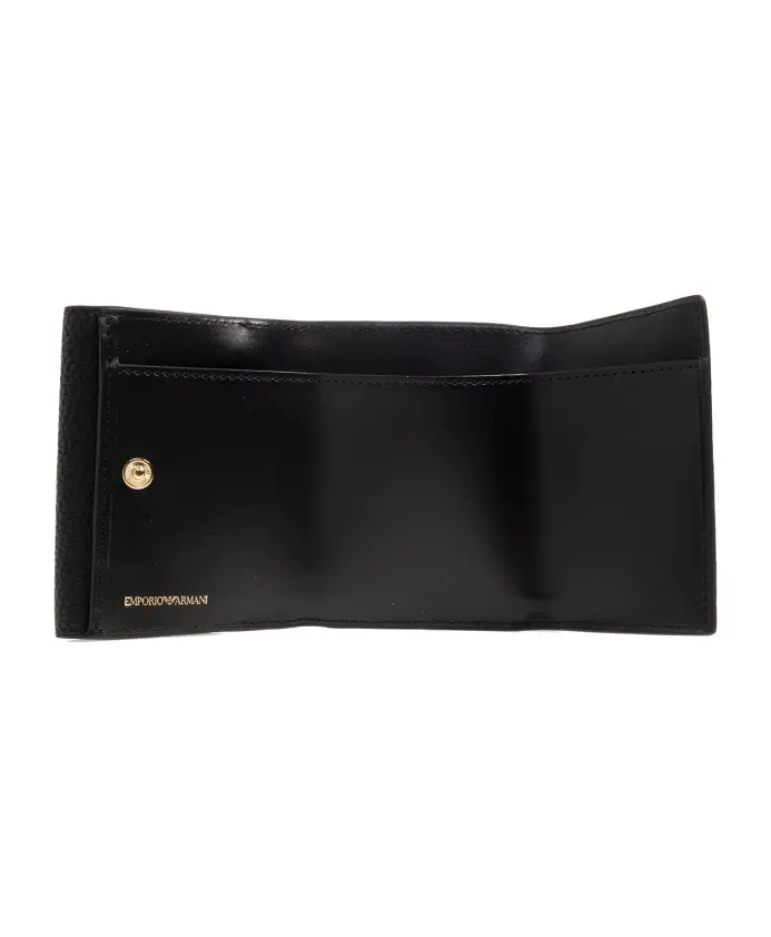 Черный складной кошелек от Emporio Armani. Это изделие из искусственной кожи застегивается на кнопку и имеет золотистый логотип спереди, карман для монет, закрывающийся на кнопку, а также два отделения для купюр и отделение для карт внутри. Ширина: 7,5 смДлина: 10 см