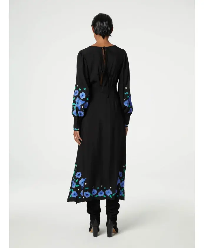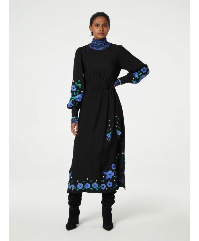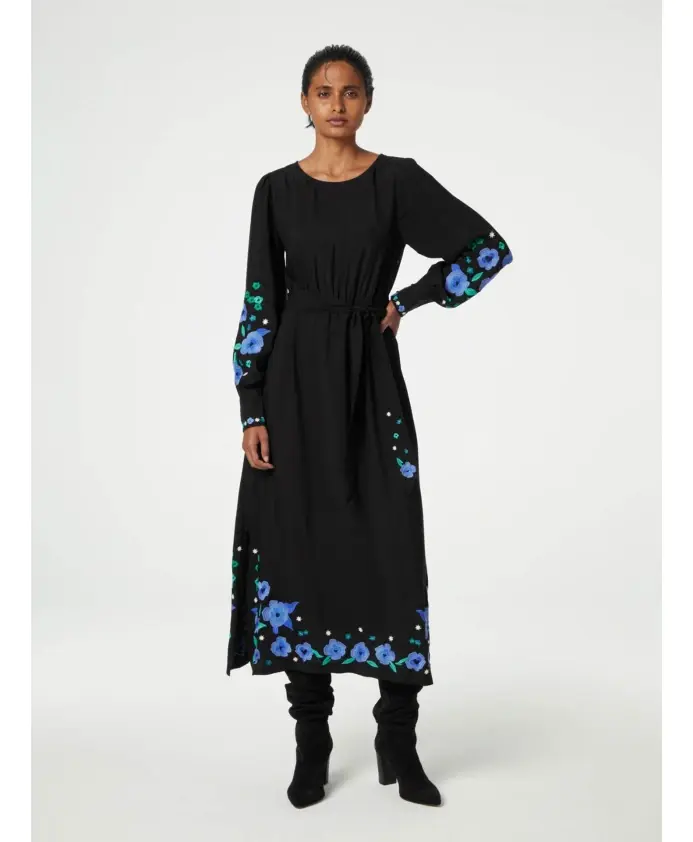 Длинное платье с цветочной вышивкой и рукавами-фонариками. Платье «Дарья» имеет круглый вырез, завязывающийся пояс и пуговицы, обтянутые тканью. Платье Дарья изготовлено из 100% вискозы (FSC).