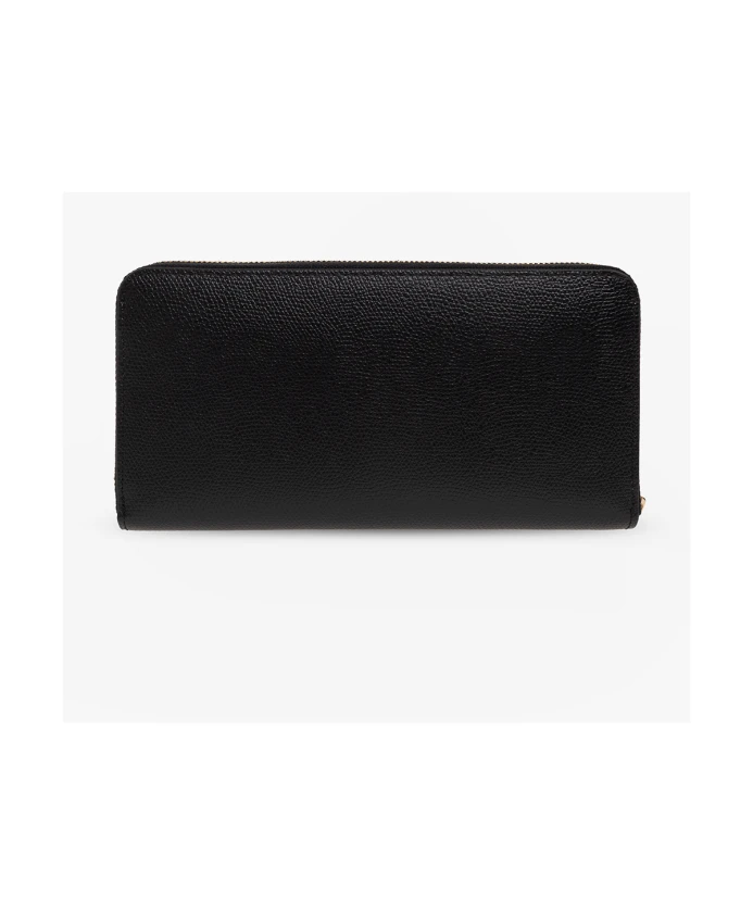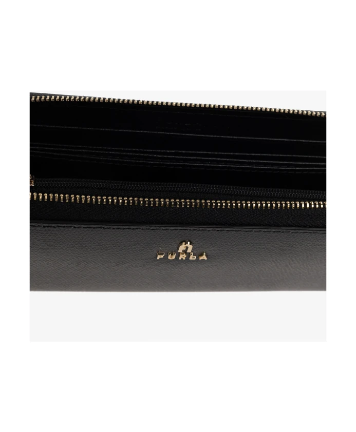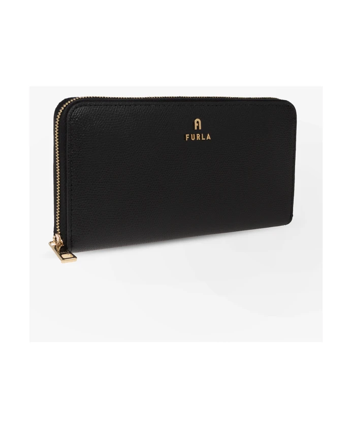 Черный кошелек "Камелия" от Furla. Эта модель, выполненная из кожи, имеет застежку-молнию, аппликацию с логотипом, золотистую металлическую фурнитуру, три отделения, десять отделений для карт, отделение для купюр и внутренний карман для монет.