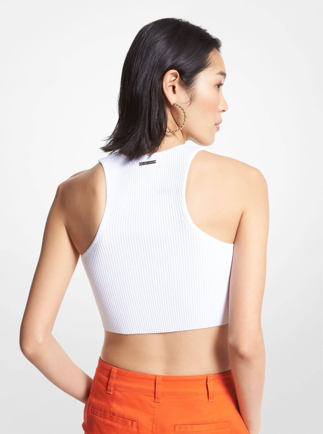 Эта укороченная майка — отличная отправная точка для создания множества нарядов. Изготовлена из эластичной вискозы. Имеет высокий вырез и спинку с открытыми лопатками, что придает ей спортивный вид. Носите ее с высокими брюками-карго и блейзером или с шортами в летние выходные.