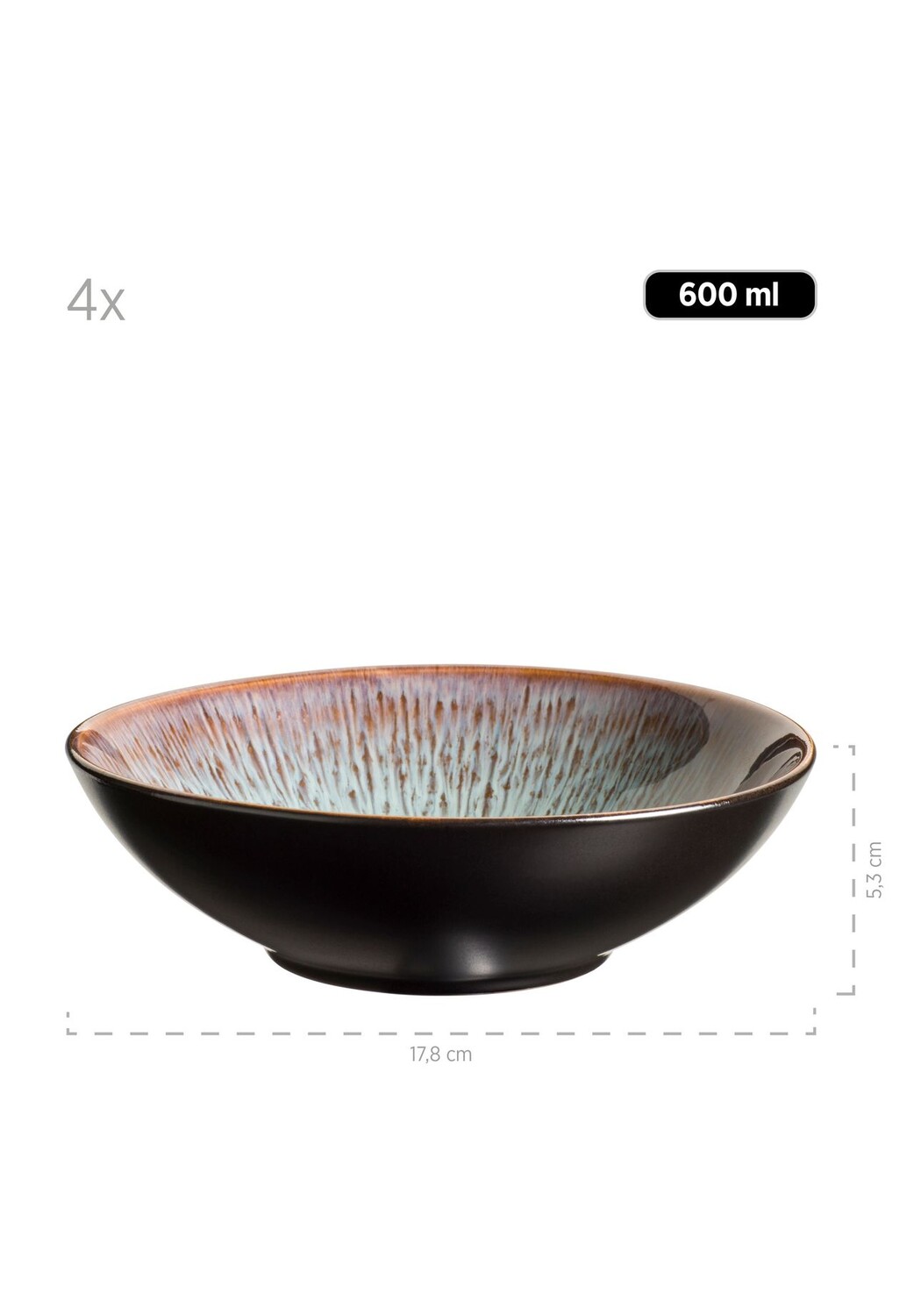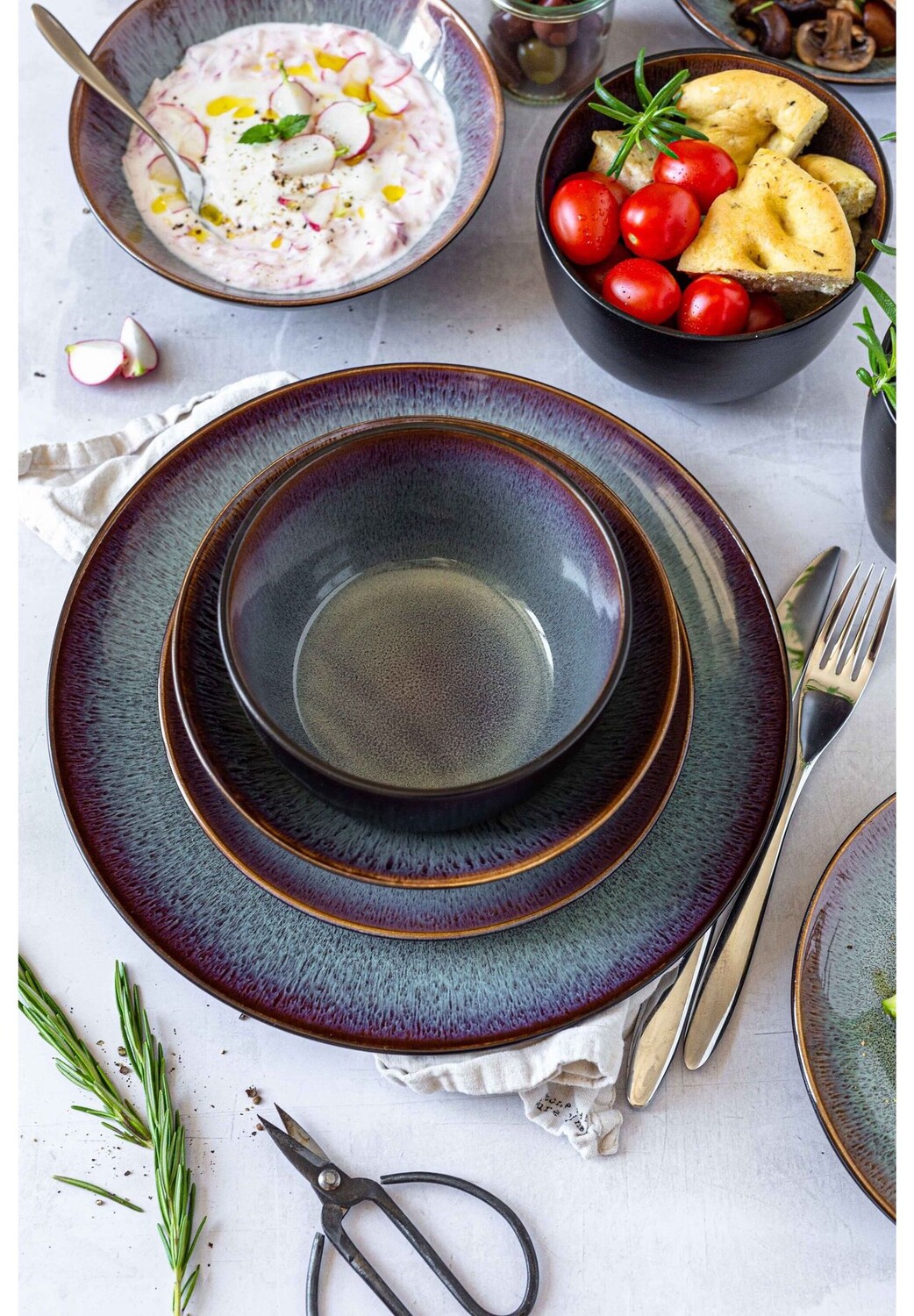 Описание товара: Прекрасные яркие естественные цвета от зелено-синего до красно-коричневого создают идеальный контраст с полуматовой черной внешней глазурью. Цвета по-разному перетекают друг в друга на каждом предмете коллекции Teona, поэтому каждая тарелка, миска и кофейная кружка имеют уникальный цветовой узор. Специальная глазурь, которую традиционный австрийский бренд MÄSER использует для этой коллекции, переливается разными оттенками в зависимости от освещения. Серия керамической посуды «Teona», изготовленная из высококачественного керамогранита (не путать с гораздо более хрупким керамогранитом), несмотря на свой необычный внешний вид, пригодна для использования в микроволновой печи и посудомоечной машине и поэтому абсолютно подходит для повседневного использования. Этот набор посуды поставляется в упаковке для посылок, изготовленной из экологически чистых материалов, неоднократно проверенных на устойчивость к разрушению. Обратите внимание: данная коллекция глазурована вручную, что означает минимальные дефекты глазури, небольшие...
