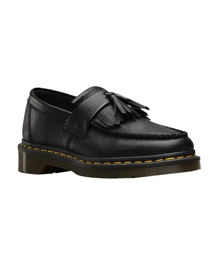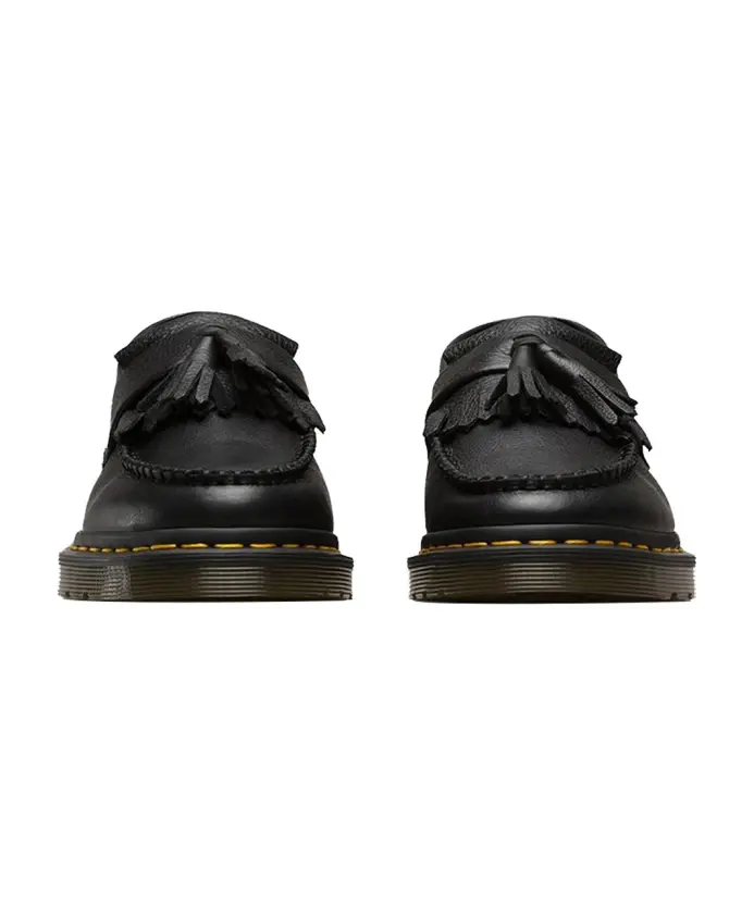 Выходите на улицу стильно вместе с Dr. Женские лоферы Martens Adrian черного цвета. Лоферы изготовлены из мягкой мелкозернистой кожи с гладким и мягким эффектом, кисточками и бахромой спереди. Оригинальная подошва высотой 3,17 см с классической желтой строчкой. Изготовлен из 100% кожи.
