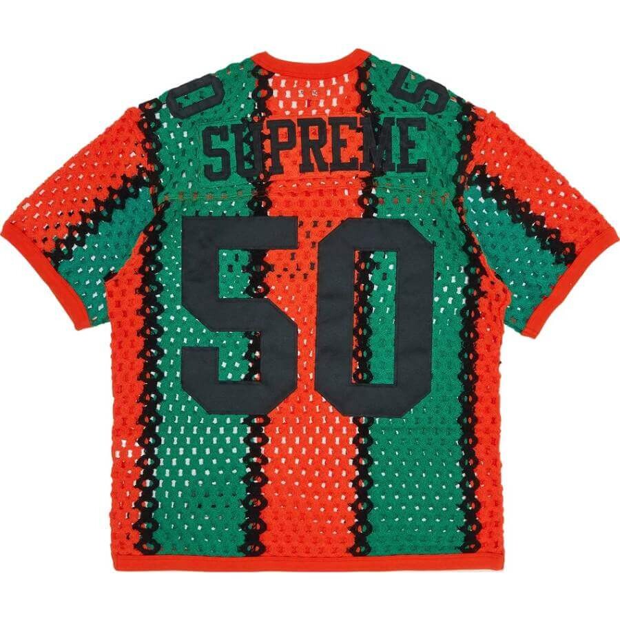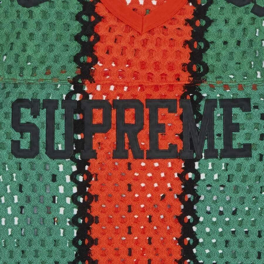 Акриловая трикотажная футболка-сетка с люверсами. Аппликация из твила на груди, плечах и спине. Спортивная этикетка внизу спереди.
