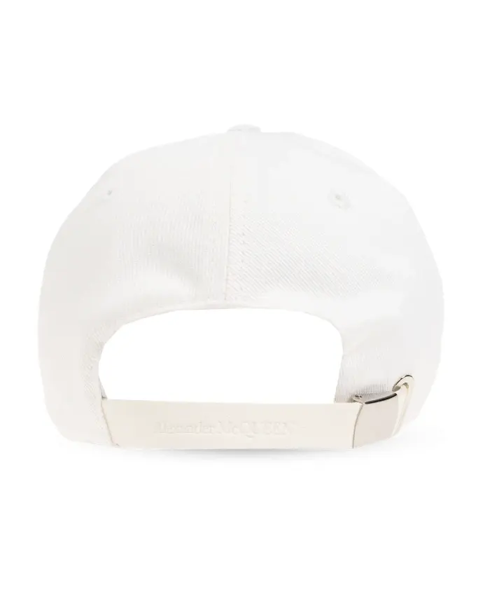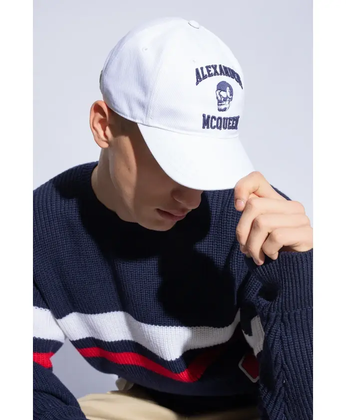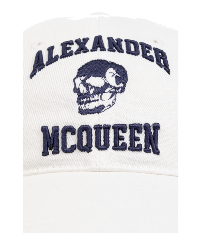 Белая бейсболка Александра Маккуина. Это изделие, изготовленное из хлопкового полотна, оснащено регулируемым ремешком с тиснением логотипа, фирменным изображением черепа и логотипом бренда темно-синего цвета.