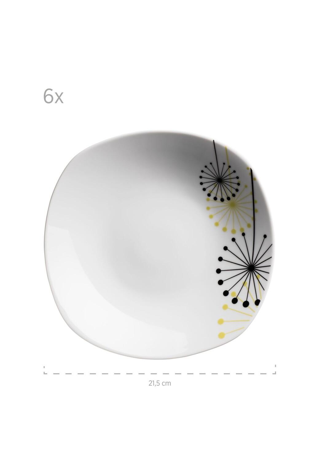 Описание предмета: Стилизованный цветочный декор привлекает внимание на наборе тарелок Vanesa. Черно-белый дизайн придает ему элегантный сдержанный вид и предлагает множество возможных комбинаций с цветочным декором и интересными кулинарными творениями. Этот набор посуды привнесет нотку природы в каждый дом. Квадратная форма с закругленными углами придает обеденному столу дополнительное разнообразие. Набор тарелок Vanesa можно мыть в посудомоечной машине и использовать в микроволновой печи, что делает уход за ним чрезвычайно простым. Данный набор посуды отправляется в почтово-транспортной упаковке, изготовленной из экологически чистых материалов, специально разработанной для данной услуги и многократно проверенной. Обратите внимание: для объективного сравнения наши объемы наполнения предполагают, что контейнер заполнен до краев. Из-за особой техники глазурования возможны незначительные отклонения в цвете. Набор посуды состоит из: 6 плоских тарелок 25 см, 6 глубоких тарелок 21,5 см, 6 декоративных тарелок.