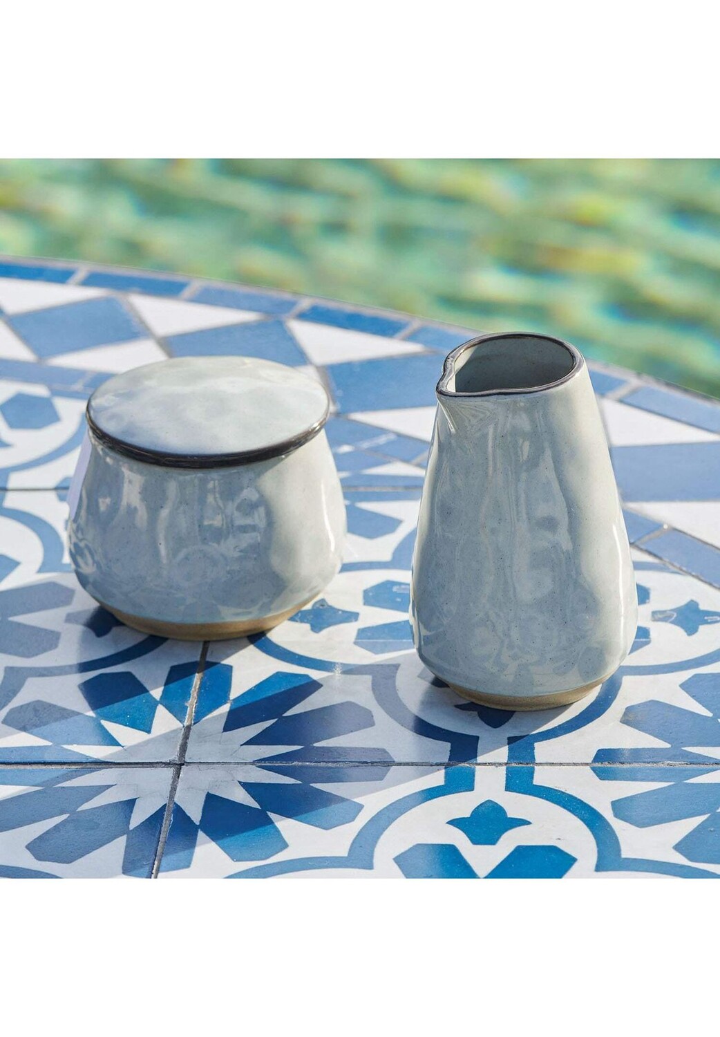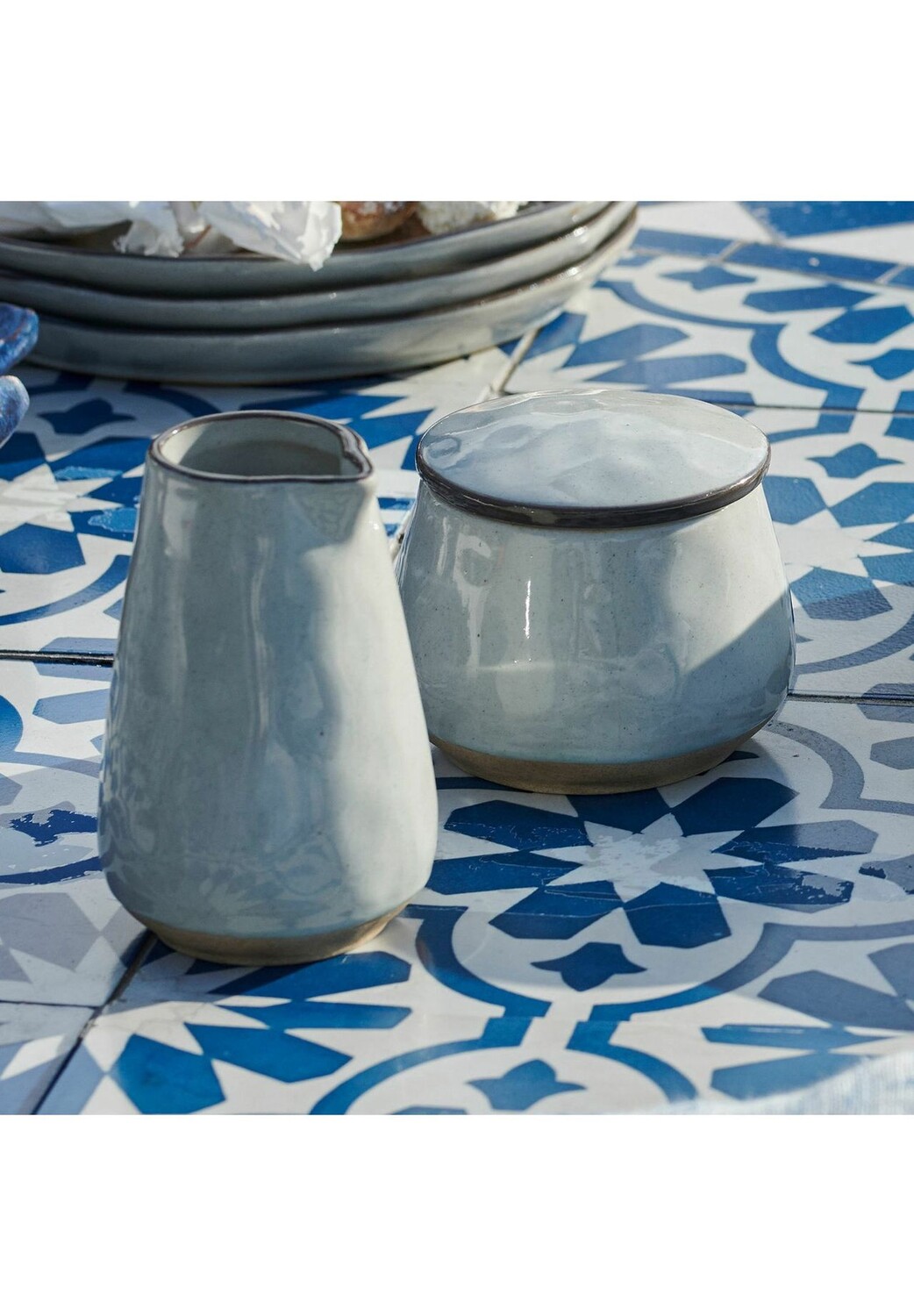 Описание предмета: Керамическая посуда с шармом ручной работы. Средиземноморский характер. Универсальный в использовании. Красивый набор имеет очень оригинальный шарм. Он намеренно спроектирован так, чтобы быть немного неровным, что придает ему вид ручной работы. Гармоничный комплект из сахарницы и молочника идеально подходит для чаепития, но его можно использовать и для других целей – например, для сока и других небольших угощений, в качестве мини-вазочек или для хранения. Он очень хорошо смотрится на завтраке или ужине, например, с оливками в банке и маслом в кувшине. Универсальная вещь с неподвластным времени очарованием.