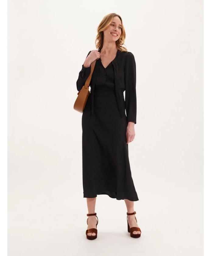 Улучшите свой гардероб черным платьем Ariel от Ines De La Fressange Paris. Это длинное элегантное платье выполнено из крепа и имеет приталенный крой на груди, расширяющийся книзу, создавая струящийся силуэт. V-образный вырез с бантом — тонкий элегантный акцент, придающий этому платью нотку изысканности. Длина и крой подчеркивают вашу фигуру, а цвет делает его отличным платьем для коктейльной вечеринки.