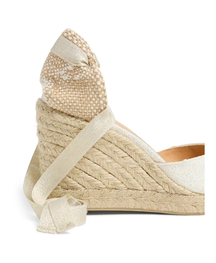 Подчеркните свой стиль с помощью этих красивых бело-золотистых туфель на танкетке Castañer Carina. Эти льняные туфли на танкетке металлизированного цвета, изготовленные вручную в Испании, имеют закругленный носок, плетеный каблук и металлическую золотистую ленту, завязанную на лодыжке. Подошва из вулканизированной резины и внутренняя часть из овчины обеспечивают комфорт и долговечность. Общая высота: 9 см; Высота плато: 2 см; Высота клина: 7 см.