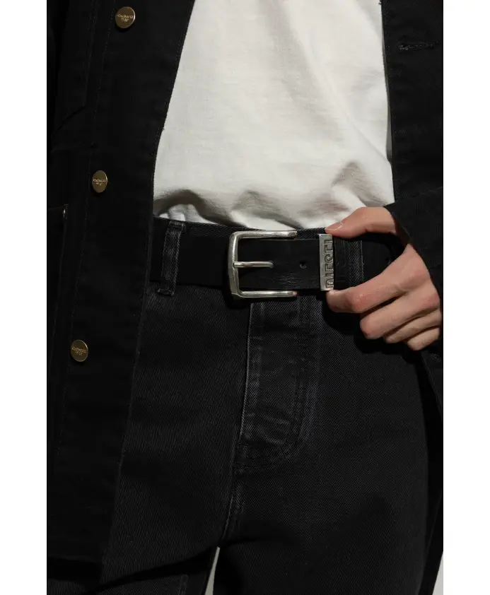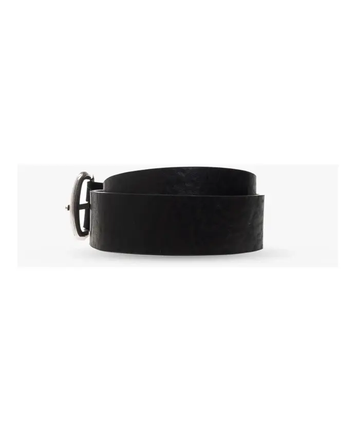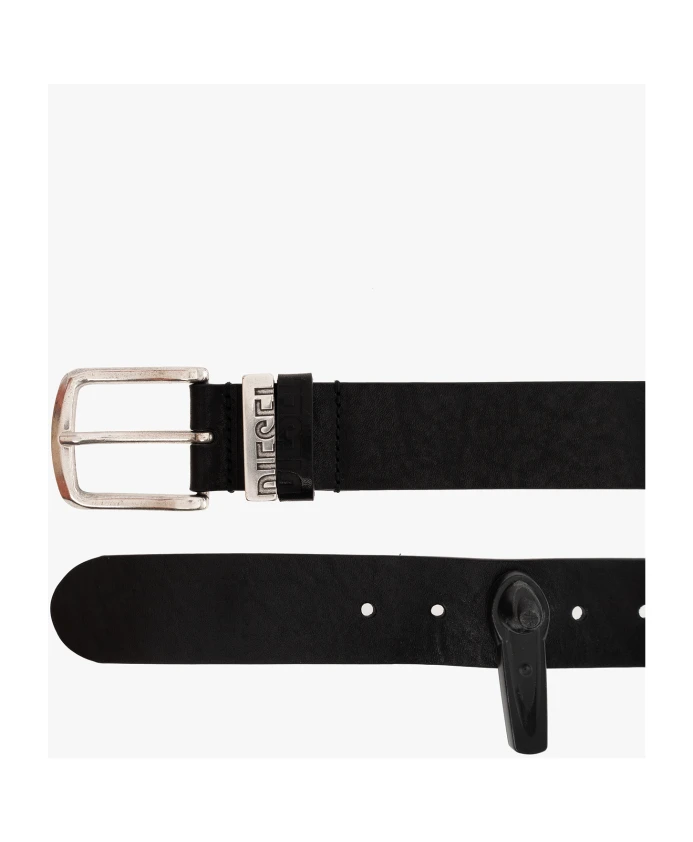 Дизельный черный пояс. Это изделие выполнено из кожи и дополнено металлической фурнитурой серебристого цвета, в том числе пряжкой и аппликацией с выгравированным логотипом. Ширина: 4 см.