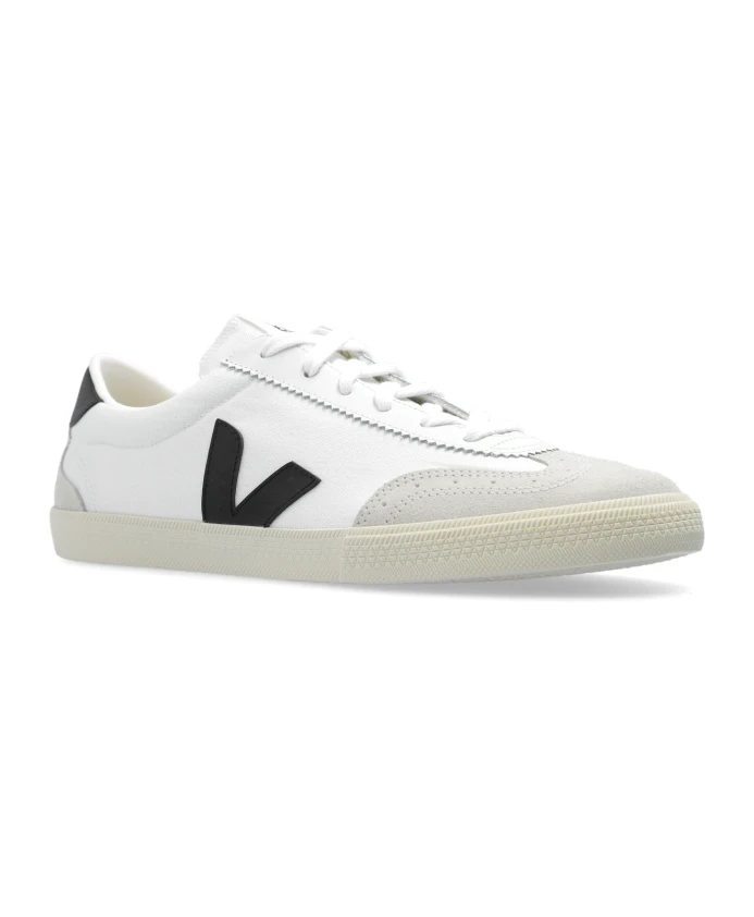 Бело-Бежево-Черные кеды из парусины от Veja. Эта модель на шнуровке, выполненная из ткани и отделанная замшей, имеет кремовую резиновую подошву и украшена логотипом бренда. Высота подошвы: 2 см.