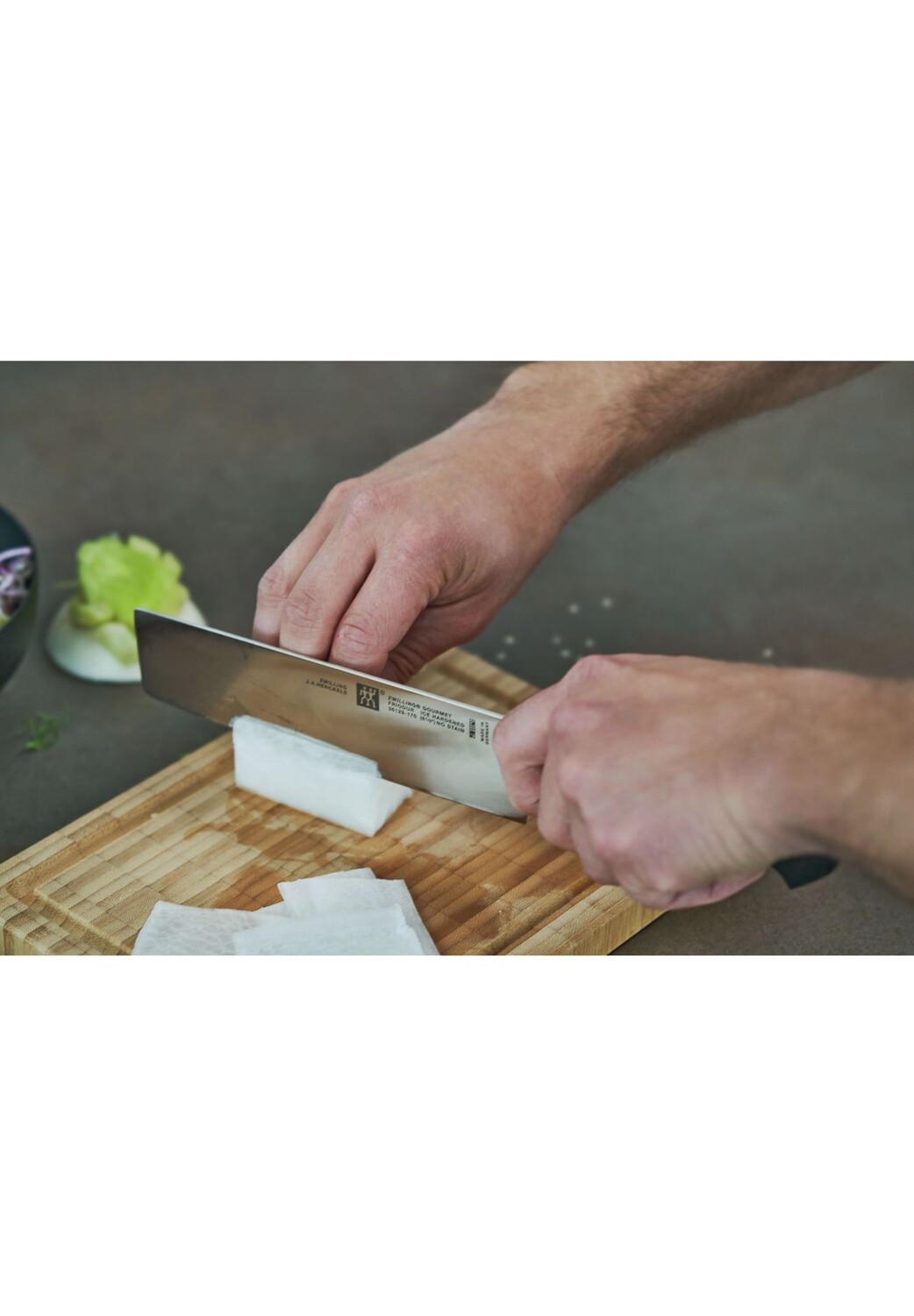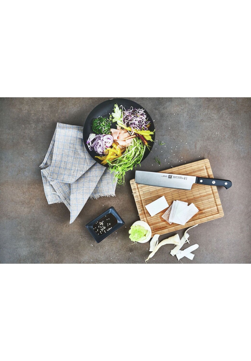 Описание предмета: Японский нож накири из серии ZWILLING Gourmet традиционно спроектирован как нож для овощей, но его можно использовать и для приготовления многих других блюд. Нож Накири также подходит, например, для трав, салатов и мяса. Практичность после нарезки: благодаря лезвию длиной и шириной 17 см мелко нарезанные или нарезанные продукты можно взять и положить в миску, сковороду или вок. Популярен среди профессионалов, подходит новичкам.